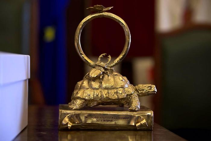 Una scultura, alta circa 20 centimetri, che prima di essere realizzata in bronzo è stata predisposta in cera. “Volevo che ci fosse l’elemento dell’anello, che era al centro della committenza - ha spiegato Raspini - ma ho voluto portare anche simboli del nostro messaggio animalier. La tartaruga, che rappresenta l’eternità; gli scorpioni e altri insetti in basso e una farfalla posta in alto, simboli della lotta tra il bene e il male, della bellezza che domina contro la barbarie”.
