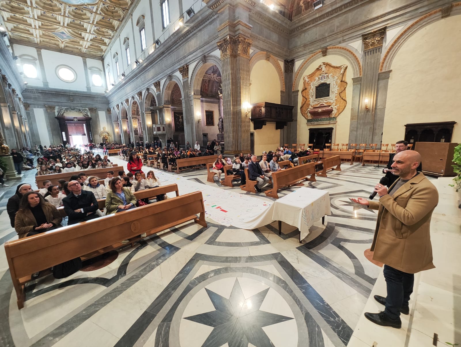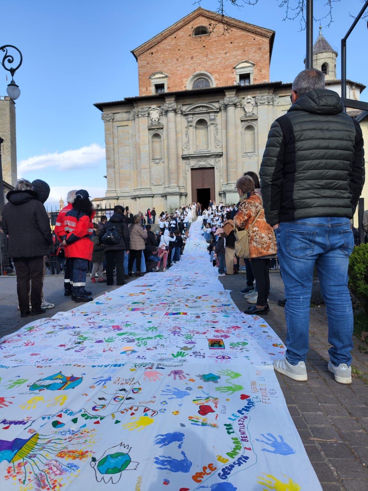 La bandiera della pace ha avvolto piazza Matteotti in tutta la sua lunghezza e sulle note di brani “icona” dei diritti umani eseguiti dal maestro Fabio Battistelli ed Anthony Guerrini e con l’esibizione delle allieve e allievi del Consorzio Castello Danza e l’apporto della scuola comunale di musica Giacomo Puccini, sollevata dai bambini è stata portata in piazza Gabriotti attraverso un percorso di festa e inni alla pace per poi essere posizionata all’interno della cattedrale lungo la navata centrale con una parte che è scesa dalla scalinata che si affaccia suoi giardini del Cassero. Terminati i canti, tutti i presenti si sono ritrovati nel Duomo per la preghiera per la pace. Da oggi sarà esposta all’interno della chiesa di San Domenico fino al 13 aprile e poi viaggerà in tutto il mondo.