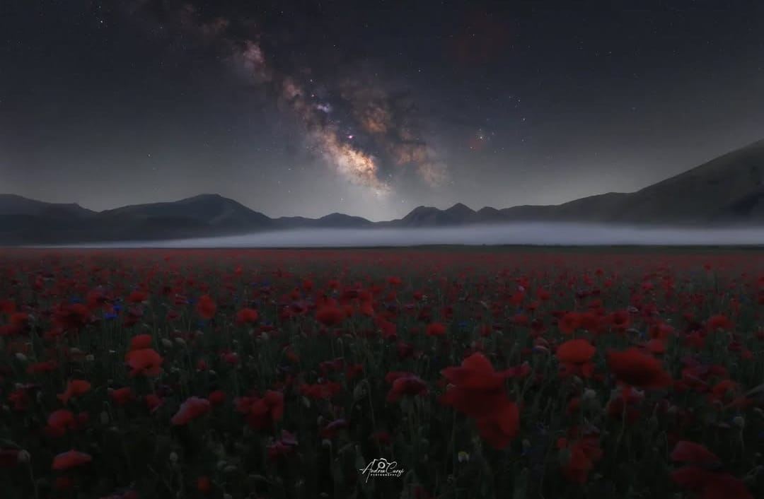 La Piana di Castelluccio, nel Parco Nazionale dei Monti Sibillini, è un luogo iconico non solo per la sua fioritura estiva, ma anche per il suo cielo spettacolare. A circa 1.450 metri di altitudine e lontana da città e paesi, questa vasta pianura offre una vista a 360 gradi sulle Perseidi. L'isolamento della piana, raggiungibile da Norcia o Castelluccio, la rende uno dei luoghi più bui dell'Umbria, perfetto per scorgere anche le meteore più deboli.