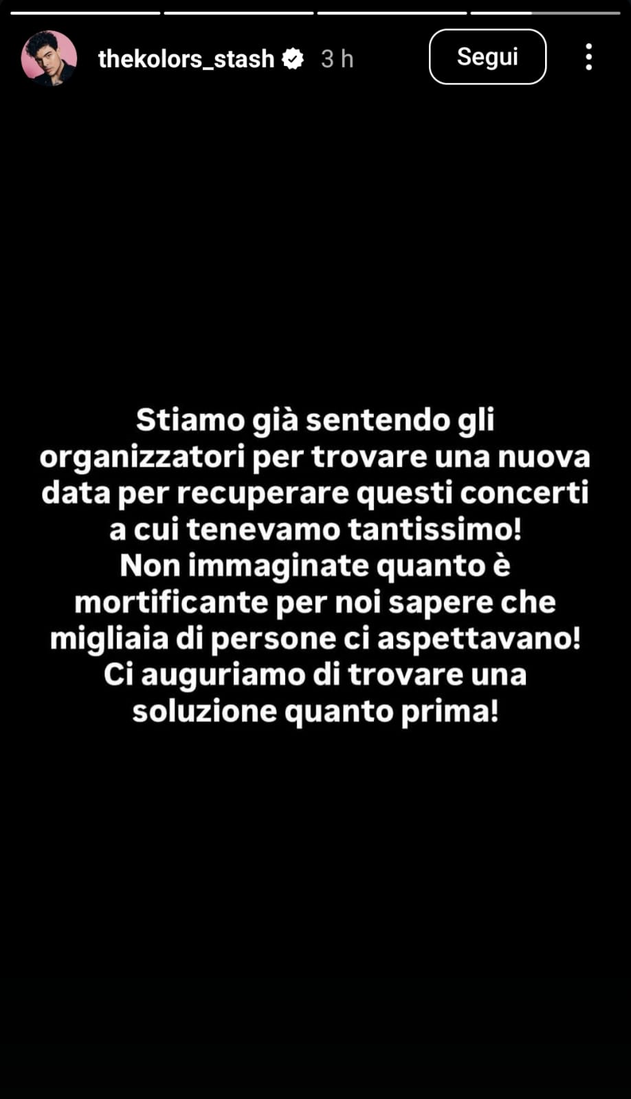I dettagli tecnici sono emersi dalla nota rilasciata dal management e rilasciata da Italpresse: "A causa del perdurare dello stato di salute di Stash, sono annullati i concerti dei The Kolors di oggi 22 agosto a Messina e di domani 23 agosto a Gela (CL). Verranno date entro domani informazioni in merito ai rimborsi e all’eventuale possibilità di recuperare prossimamente le date cancellate". Ai video parlati di Stash segue poi una scritta bianca su sfondo nero: "Stiamo già sentendo gli organizzatori per trovare una data per recuperare questi concerti a cui tenevamo tantissimo! Non immaginate quanto è mortificante per noi sapere che migliaia di persone ci aspettavano! Ci auguriamo di trovare una soluzione quanto prima!".