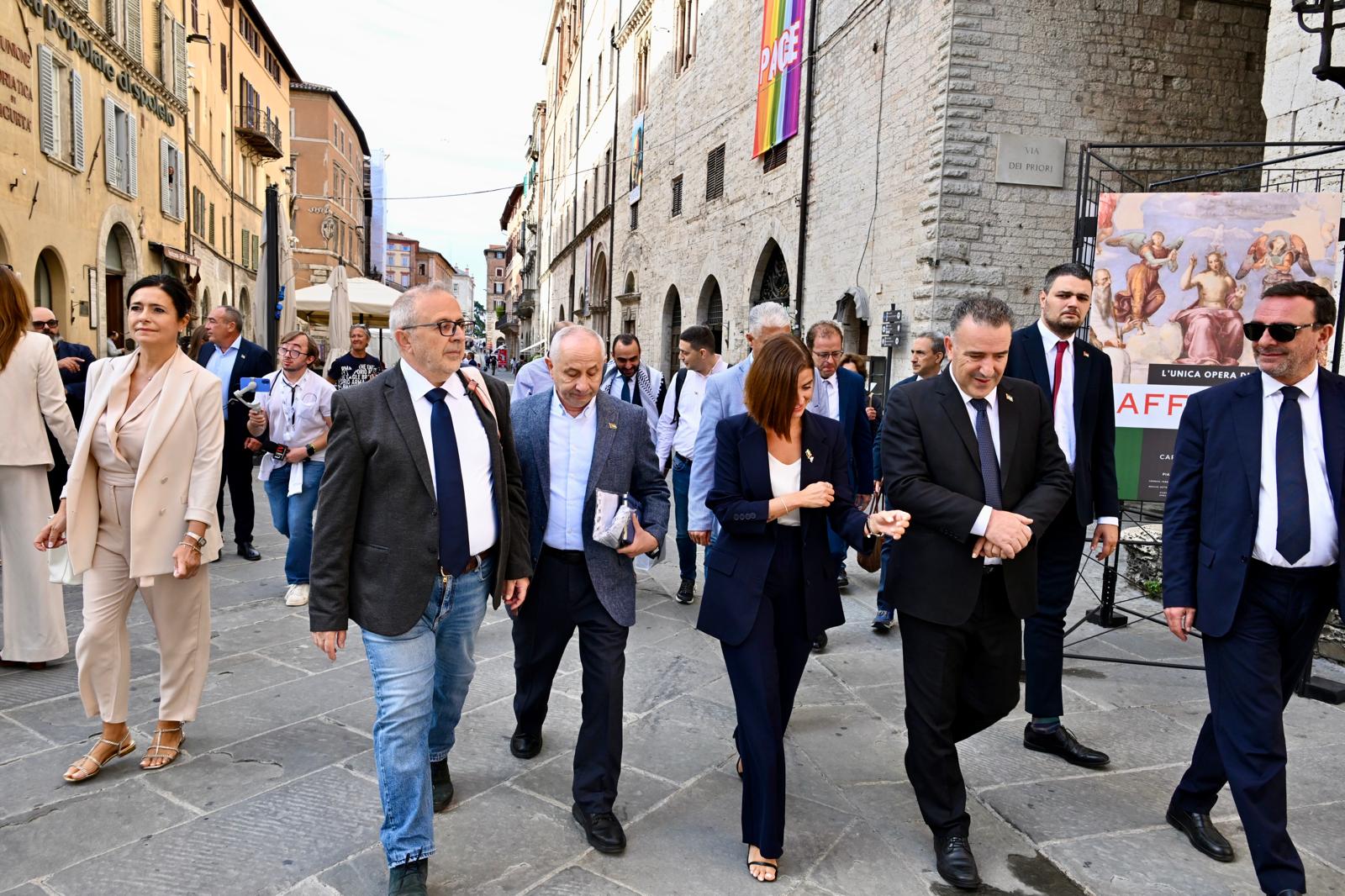 La sindaca ha ricordato le iniziative del Comune di Perugia a sostegno della Palestina, tra cui una lettera inviata alla presidente del Consiglio, Giorgia Meloni, per chiedere il riconoscimento dello Stato di Palestina, e un ordine del giorno del Consiglio comunale che impegna l'amministrazione a promuovere un cessate il fuoco immediato, il riconoscimento dello Stato palestinese e la creazione di corridoi umanitari per garantire accoglienza e rispetto dei diritti umani. "Come delegata alla pace di Anci nazionale, lavorerò per rafforzare questa rete di diplomazia dal basso - ha proseguito Ferdinandi .- La pace, come diceva Capitini, non è solo assenza di guerra, ma giustizia, rispetto ambientale e diritti. Non c’è pace se persistono ingiustizie". Rivolgendosi ai sindaci palestinesi, la sindaca ha concluso: "Siete un esempio di resistenza e futuro. Il vostro lavoro quotidiano è un seme di speranza. Perugia e l'Umbria saranno sempre al fianco del popolo palestinese, coltivando insieme il sogno di una Palestina libera".