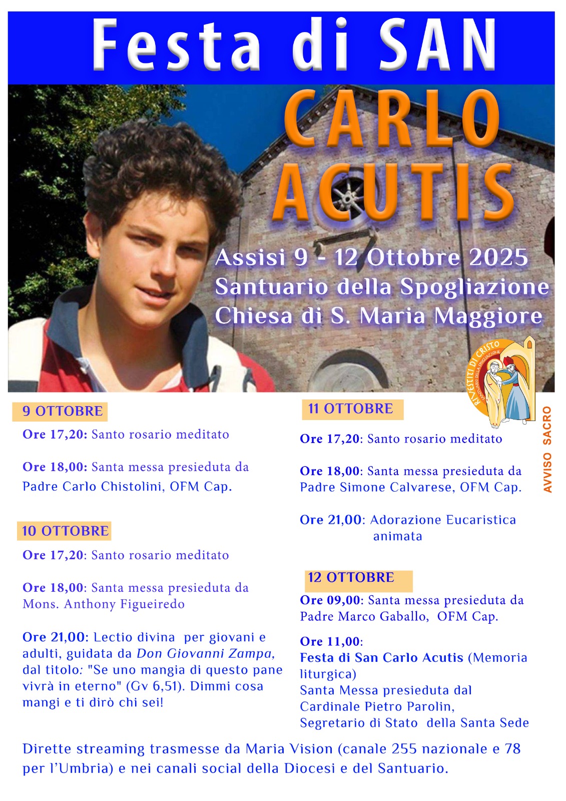 Il programma si articola in quattro giorni di celebrazioni eucaristiche, precedute ogni giorno alle ore 17.20 dal santo rosario meditato. Si inizia giovedì 9 ottobre alle 18.00 con la santa messa presieduta da padre Carlo Chistolini, vice presidente della Fondazione diocesana Santuario della Spogliazione. Venerdì 10 ottobre, la celebrazione delle 18.00 sarà presieduta da monsignor Anthony Figueiredo, responsabile delle Relazioni internazionali della diocesi; in serata, alle 21.00, è prevista una lectio divina per giovani e adulti sul tema "Se uno mangia di questo pane vivrà in eterno", tenuta dal vicario generale don Giovanni Zampa. Sabato 11 ottobre, la messa delle 18.00 sarà presieduta da padre Simone Calvarese, ministro provinciale dei cappuccini d'Abruzzo, Lazio e Umbria. Infine, domenica 12 ottobre, giorno della memoria liturgica di San Carlo Acutis, alle ore 9.00 si terrà la santa messa celebrata dal rettore del Santuario padre Marco Gaballo.