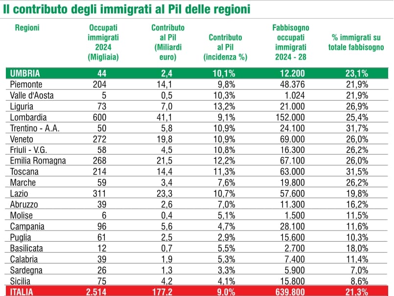 Decisiva anche la proiezione futura. Secondo le previsioni Excelsior-Unioncamere, tra il 2024 e il 2028 le imprese umbre avranno bisogno di 12.200 nuovi lavoratori immigrati. Si tratta del 23,1% del fabbisogno totale di manodopera: quasi un lavoratore su quattro. A livello nazionale, il fabbisogno sarà coperto per l’80% dal ricambio generazionale legato ai pensionamenti, e solo per il 20% dalla crescita economica. Questo significa che il ruolo della forza lavoro immigrata sarà sempre più centrale per garantire la continuità produttiva.