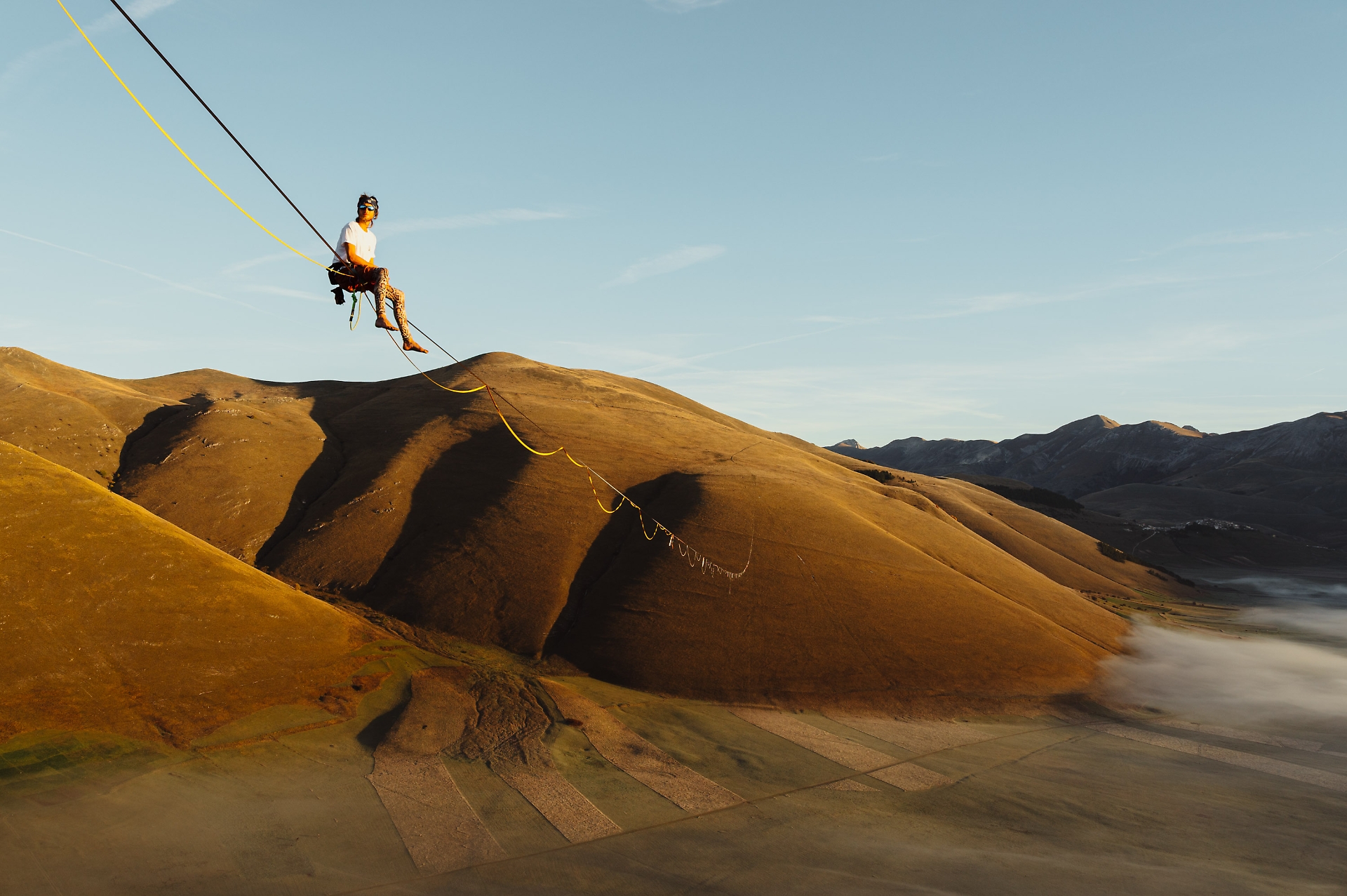 Camminano sospesi tra le nuvole del Pian Grande per quasi 2 chilometri, precisamente 1.870 metri. Impresa sportiva a Castelluccio (Norcia) per cinque atleti che hanno “passeggiato” a 300 metri di altezza su una fettuccia larga appena 2 centimetri. L’incredibile prova gli è valsa il record italiano della disciplina higline, che era fermo da una decina di anni a 1.400 metri di lunghezza. Uno degli atleti coinvolti, però, si tratta del trentino Carlo Cozzio, è andato molto oltre, percorrendo bendato i 1.870 metri di fettuccia sospesa nel vuoto. Le immagini che raccontano l’impresa sono state messe a disposizione da Alessia Festi e, oltre a essere di incredibile bellezza, raccontano anche di come l’uomo possa realizzare imprese apparentemente impossibili in contesti paesaggistici di grande pregio senza lasciare dietro di sé tracce.