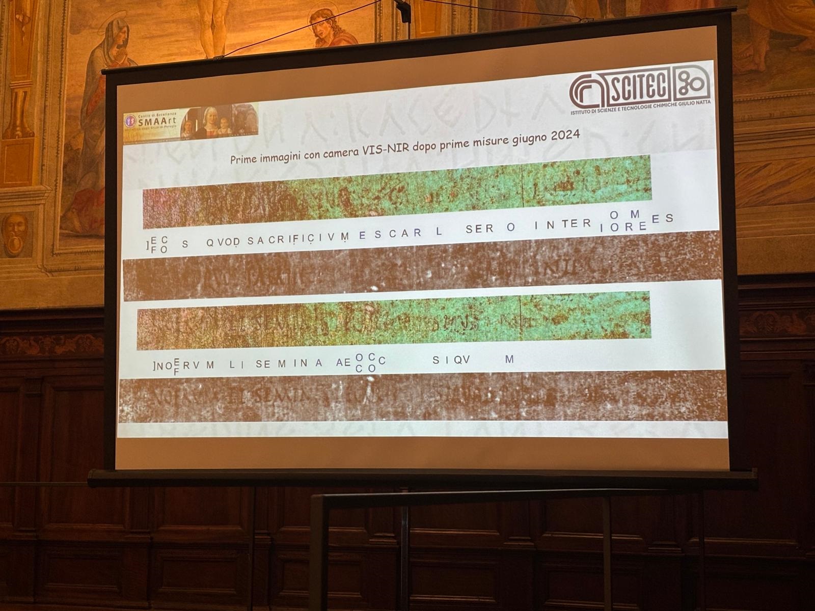 Si tratta di una frase su più righe che è in pratica il riassunto del contenuto della tavola. “Una specie di piccolo indice” ha detto il glottologo Alberto Calderini dell’Università degli Studi di Perugia. Dopo l’introduzione del direttore del Museo civico Roberto Borsellini, interessanti gli interventi del chimico Aldo Romani, di Augusto Ancillotti e Riccardo Massarelli dell’Irdau, e di Francesca Rosi del Cnr – Scitec Giulio Natta su come è stata riportata alla luce, sul tipo di strumentazione usato.