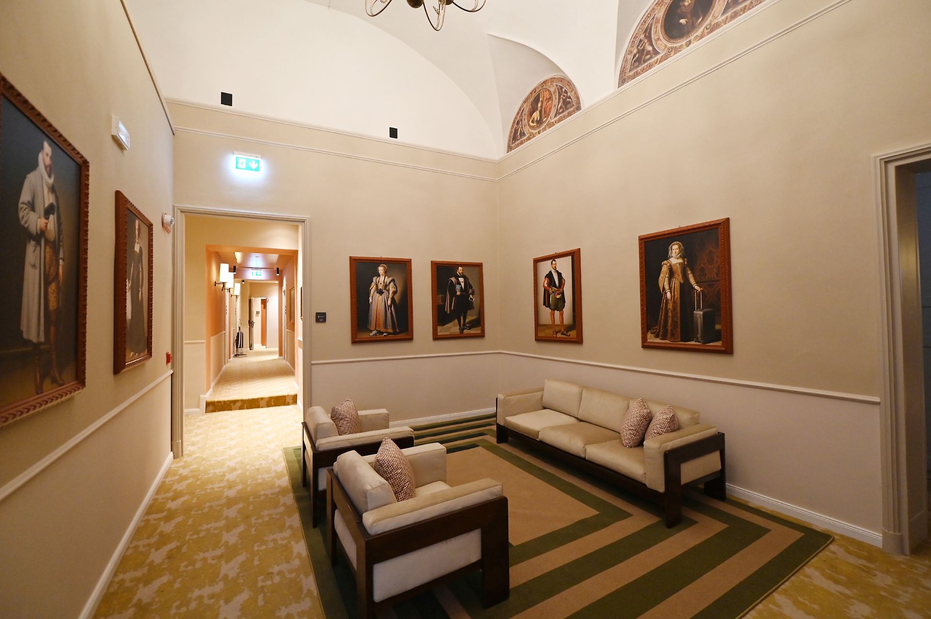 Perdendosi tra gli eleganti e luminosi corridoi che custodiscono le stanze è possibile immergersi negli spazi comuni, arricchiti da una scelta di quadri originale e giocosa: lo studio Ovre.Design ha infatti scelto di esplorare un linguaggio artistico inedito, generato con l’intelligenza artificiale, che raffigura personaggi di fantasia, pomposamente vestiti con abiti d’epoca e con un dettaglio che li catapulta nell’era contemporanea. Anche la signora Rosetta, ritratta nel quadro all’ingresso, non sfugge al tocco ironico: correda, infatti, il suo vestito di velluto damascato con pattini al posto delle scarpe e vistosi occhiali in stile Iris Apfel. Il concept progettuale parte proprio dalla metafora della cool-nana: una figura che non finge la giovinezza, ma la reinventa con stile, memoria e libertà. L’intervento architettonico ha rispettato le preesistenze rinascimentali e ne ha attualizzato il linguaggio con palette materiche contemporanee, luci teatrali, installazioni in cashmere, un casellario di chiavi d’epoca e dettagli artigianali umbri reinterpretati.