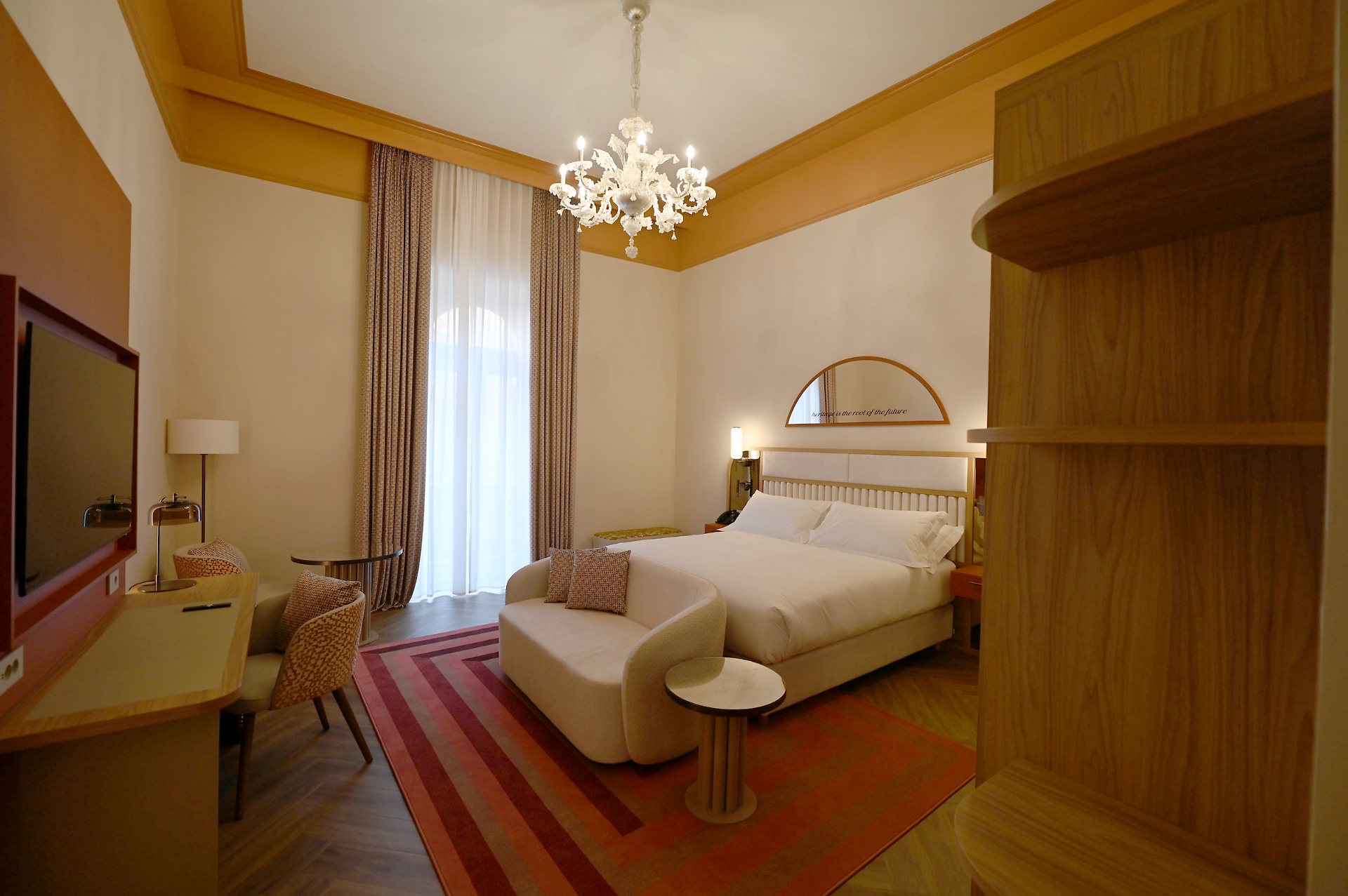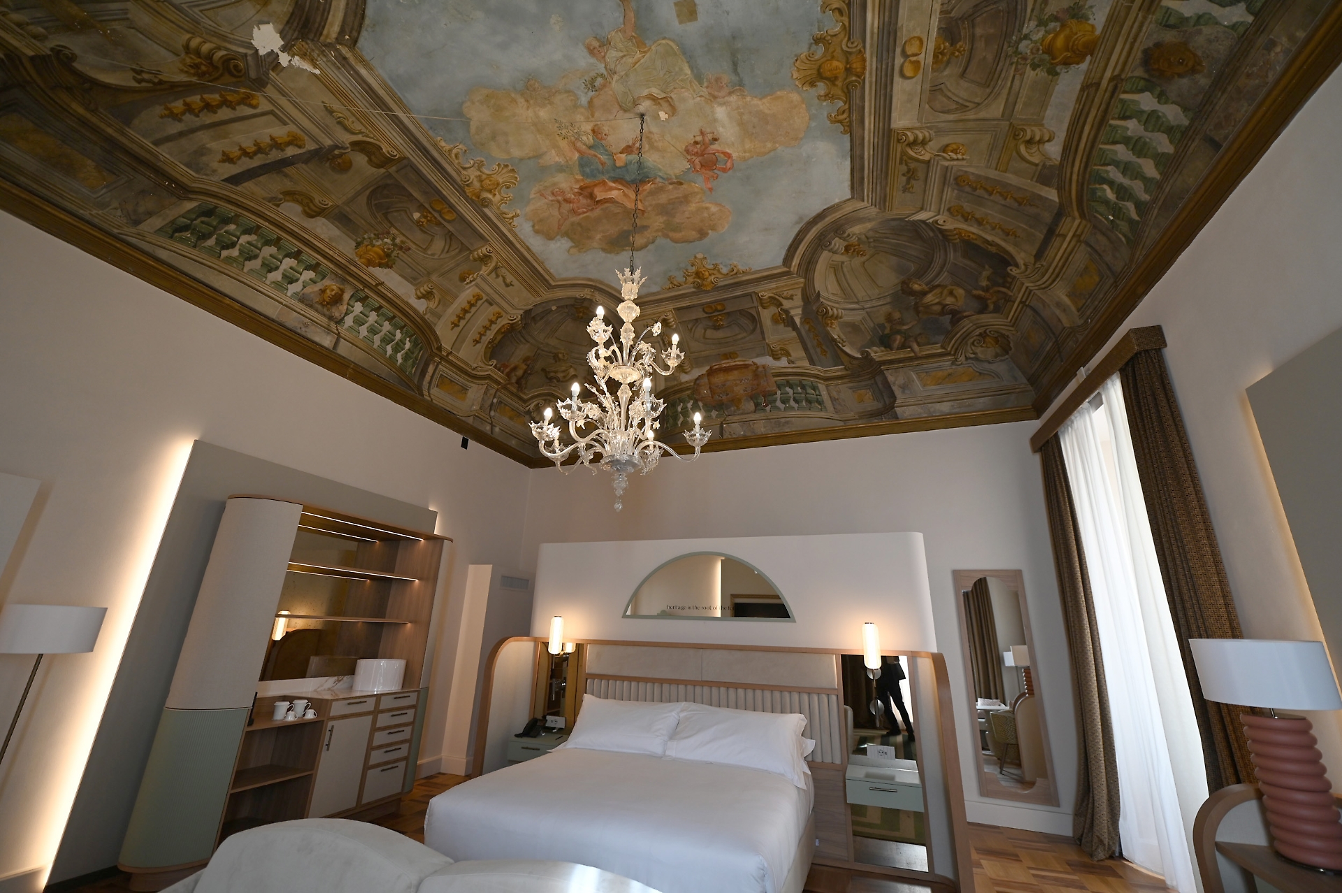 Il tour della struttura ha permesso di toccare con mano l’imponente e raffinato lavoro di ristrutturazione che ha rinnovato completamente gli spazi interni. Sui tre piani si sviluppano settanta stanze: camere standard, superior, deluxe e junior suite, con allestimenti speciali per le persone con disabilità, e poi suite con soffitti decorati, divani e salotti. Sono tutte ampie, comode, luminose, caratterizzate da preziosi arredi lignei, tappezzerie originali e elementi che uniscono antico e contemporaneo. “Heritage is the root of the future” (Il patrimonio è la radice del futuro), si legge negli ampi specchi che sovrastano i letti delle stanze. Un altro aspetto comune è il box a forma di rosa (“Un Bacio to welcome you”) appeso sulle pareti e che racchiude una coppia di Baci Perugina, così da iniziare ogni soggiorno con dolcezza e per ricordare che siamo a Perugia, dove il cioccolato è cultura, memoria, accoglienza.