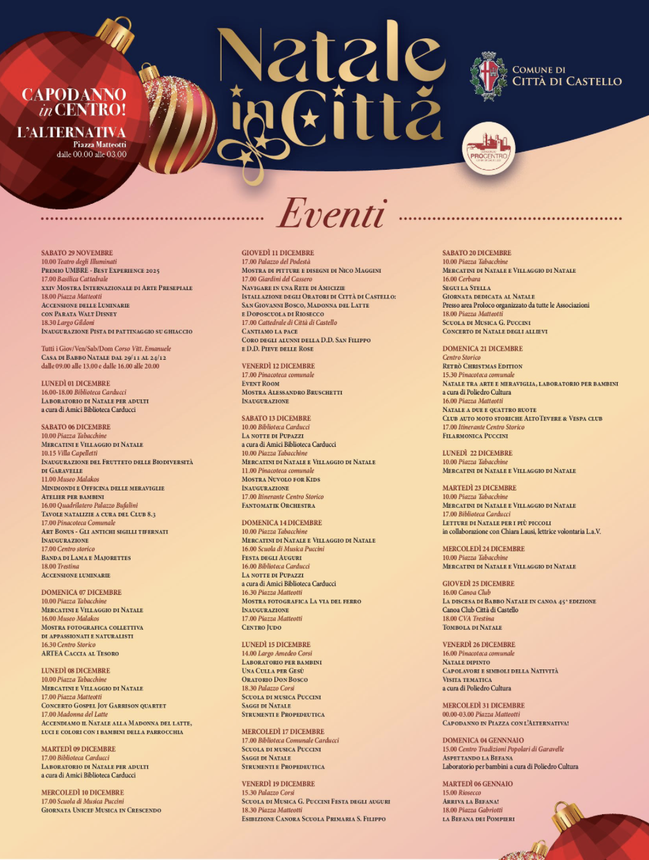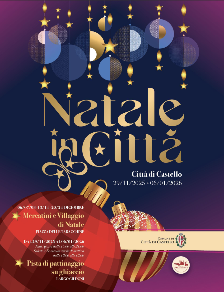 Il programma completo e tutti gli aggiornamenti saranno consultabili in tempo reale sul portale Città di Castello Turismo, sul sito del Comune, sui canali social dell’ente e sulla cartellonistica presente nei luoghi più frequentati della città. Un Natale lungo oltre un mese che promette di trasformare Città di Castello in un grande palcoscenico di luci, arte, cultura e divertimento per tutta la comunità.