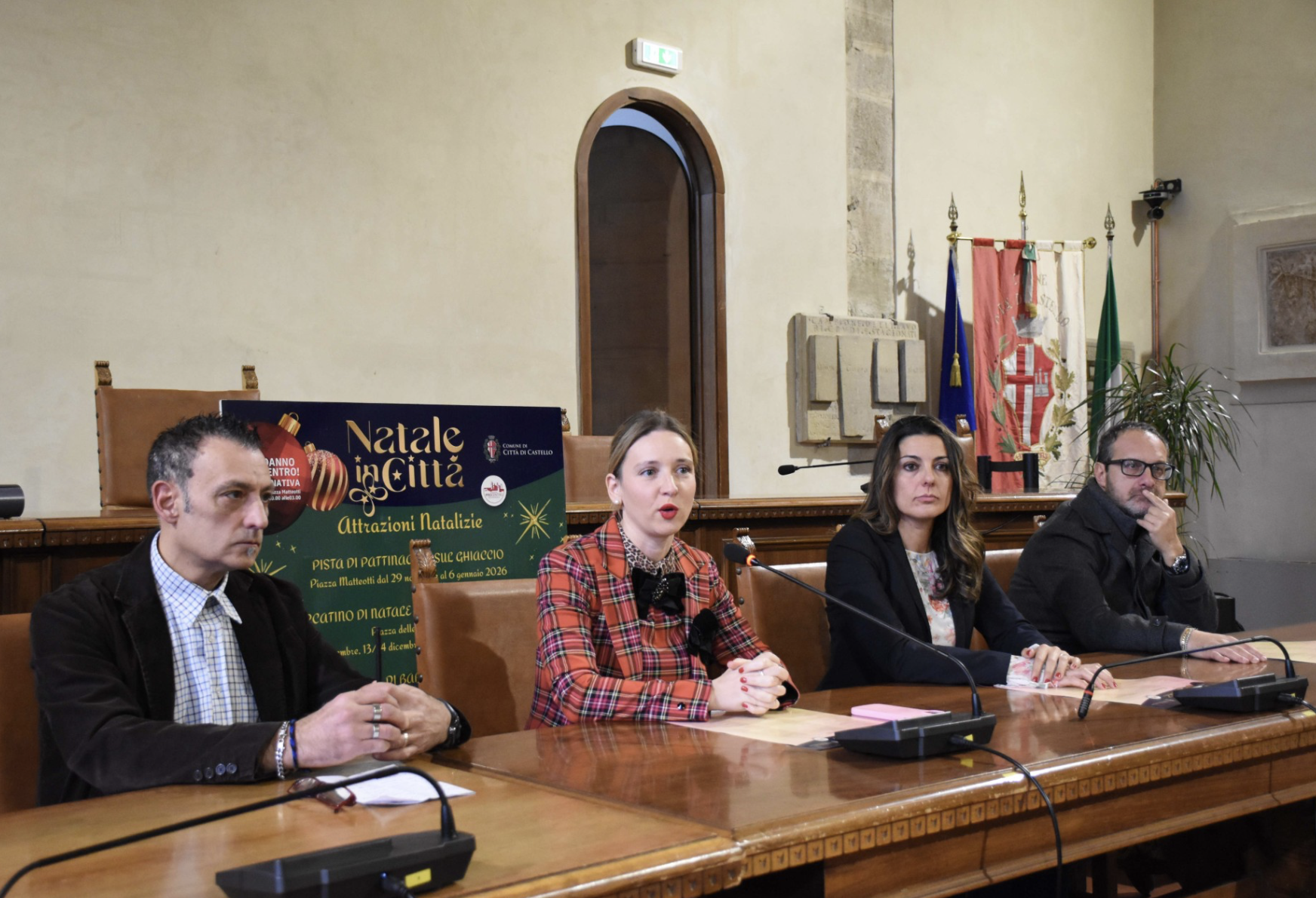 A Città di Castello il Natale si accende dal 29 novembre al 6 gennaio trasformando il centro storico in un vero e proprio spettacolo di luci, colori e atmosfera festosa. La città si vestirà a tema, con circa 50 eventi pensati per coinvolgere tifernati e turisti di ogni età, tra piazze illuminate, vie addobbate e le frazioni che si uniranno alla magia delle feste. Il calendario di Natale in città è stato presentato stamattina in conferenza stampa dall’assessore al Commercio e Turismo Letizia Guerri e dall’assessore alla Cultura Michela Botteghi, insieme al presidente del Consorzio Pro Centro Flavio Benni e al dirigente comunale Emanuele Mattei.