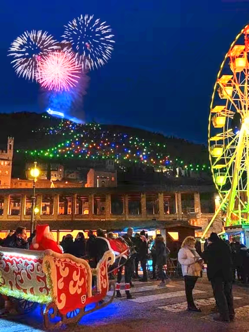 A Gubbio, che dal 7 dicembre fino al 6 gennaio si trasforma nella città del Natale, sono presenti mercatini, una ruota panoramica, la pista di pattinaggio - tutti situati in piazza Quaranta Martiri -, e Christmasland, un'esperienza immersiva che permette di viaggiare tra i presepi dal mondo e volare sulla città a bordo della slitta di Babbo Natale, grazie alla realtà virtuale.