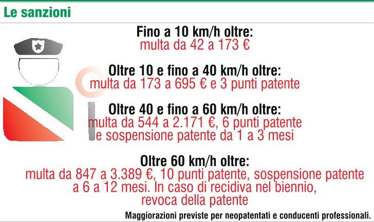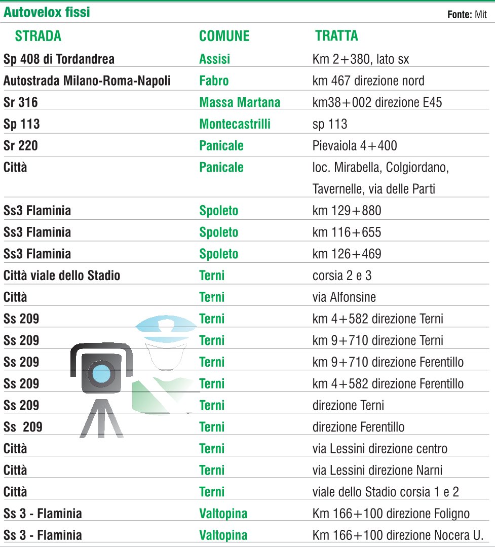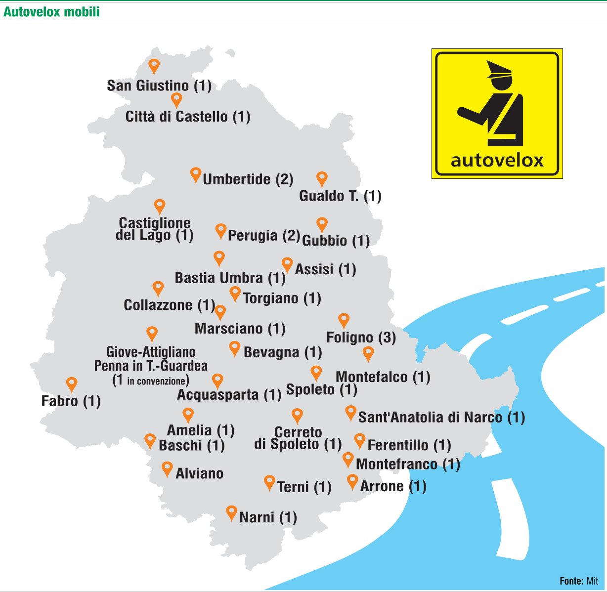 Nel frattempo, nelle strade umbre sono anche attivi i dispositivi di controllo della velocità (che non rientrano nel censimento) della polizia stradale che ogni settimana comunica i punti in cui verranno posizionati gli strumenti mobili. Fino a domenica, le postazioni saranno attive lungo la E45 (ss Tiberina Bis): km 72+500 direzione Nord (Perugia); km 73+500 direzione Sud (Perugia); km 39+750 direzione Nord (Todi); km 40+800 direzione Sud (Todi). Lungo la ss Umbro-Laziale al km 52+120 direzione Sud (Narni) e sul raccordo autostradale Bettolle-Perugia al km 57+050 direzione Est (Perugia).
