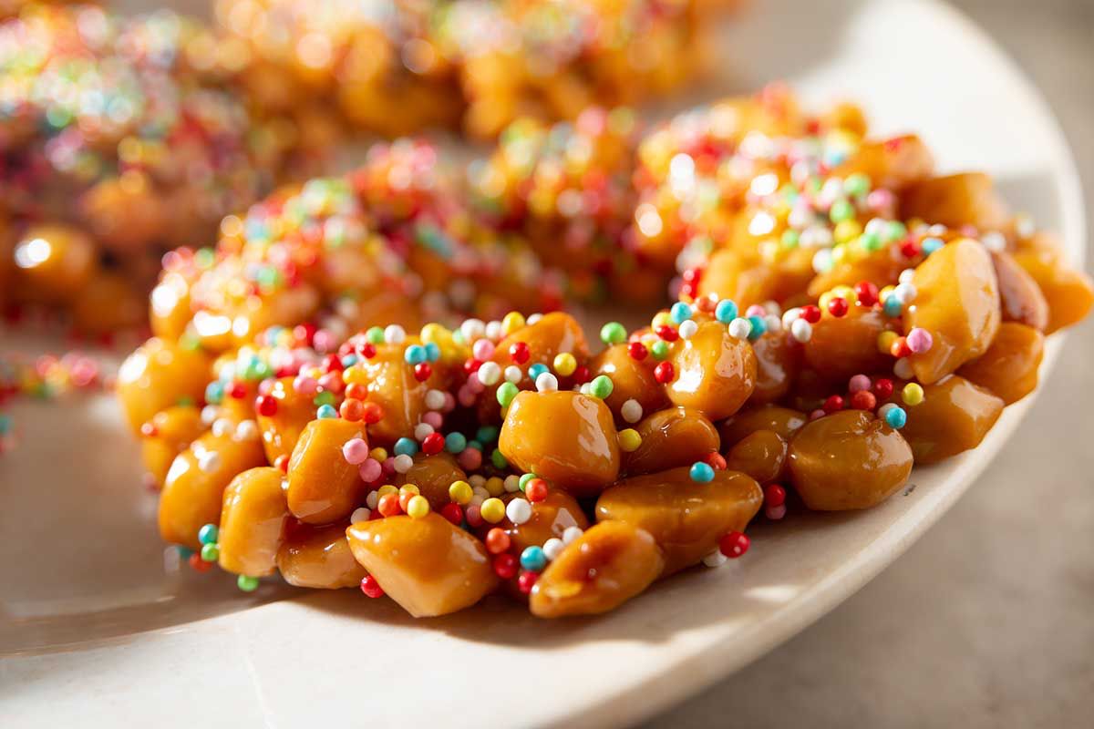 In Calabria l'imbarazzo della scelta è d'obbligo. Ci sono le alaci, dolci fritti profumati al vino e passati nello zucchero, e i cannaricoli (o turdilli), nati dalla cucina povera: farina e mosto cotto, poi miele e cannella, immersi nella melassa di fichi e serviti su foglie d’arancio, tipici di Castrovillari. Nel Cosentino, la cicerata somiglia agli struffoli ma profuma di limoncello e arancia. La giurgiulena è un croccante di sesamo e miele, a forma di rombo. Nella Locride e nella piana di Gioia Tauro si fanno le nacatole, ciambelle fritte con vino rosso, simbolo del Natale. A Reggio Calabria è tempo di petrali, ravioli di frolla con fichi secchi, frutta secca, caffè e vino cotto; lo stesso impasto si usa per le sammartine, che si preparano dall'11 novembre. Infine, dalla Sila, la pitta 'mpigliata, sfoglia arrotolata e ripiena di uva passa, noci e vermouth: un piccolo capolavoro della tradizione.