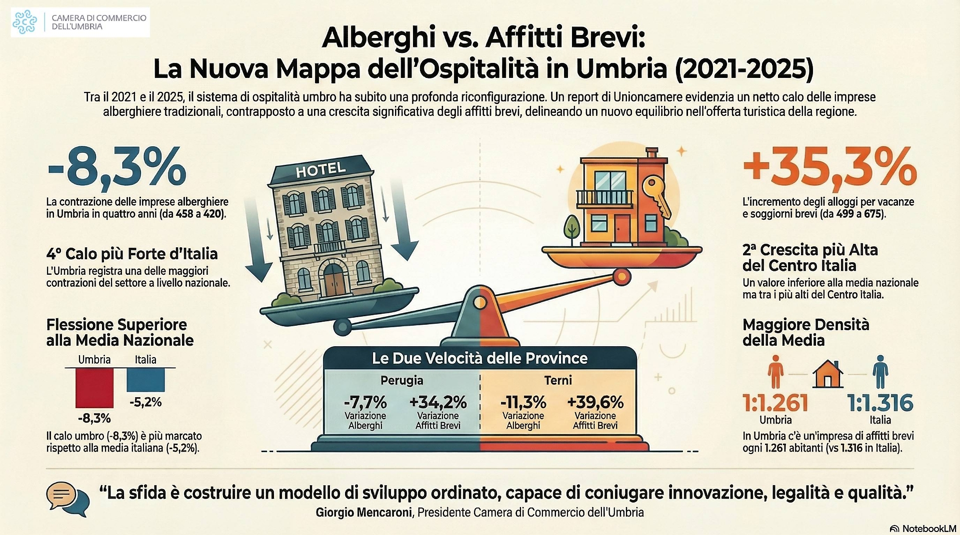 Il dato va inserito all'interno di un quadro di trasformazioni più ampio, che non riguarda solo il numero delle imprese ma il modo in cui il territorio intercetta e organizza la domanda turistica. L'Umbria - nel contesto nazionale - si colloca a metà strada tra le regioni a più ampia densità turistica e quelle che faticano ad agganciare la nuova domanda, caratterizzata da soggiorni più brevi, viaggi più frequenti, piattaforme digitali e dalla necessità di soluzioni maggiormente flessibili.