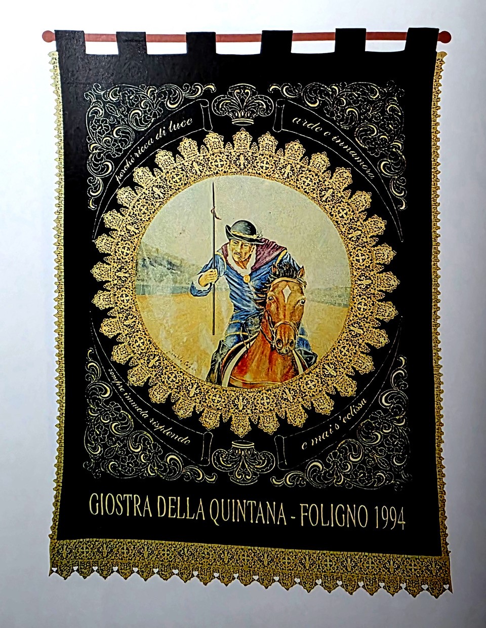 Nella sua azienda tessile vennero realizzati due Palii di straordinario pregio per la Giostra della Quintana. Il primo nel 1984, per la Giostra speciale in omaggio al Presidente della Repubblica Sandro Pertini, purtroppo non disputata a causa della pioggia. Il secondo nel 1994, donato a Irene Pivetti, allora la più giovane Presidente della Camera. Un’opera raffinata: tra volute barocche, al centro campeggiava un dipinto a olio realizzato nel reparto aziendale dei dipinti a mano, incorniciato da un rosone di macramè a simboleggiare l’anello, mentre in primo piano cavaliere e cavallo si lanciavano in piena corsa verso il bersaglio. Un palio che era racconto, identità, appartenenza.