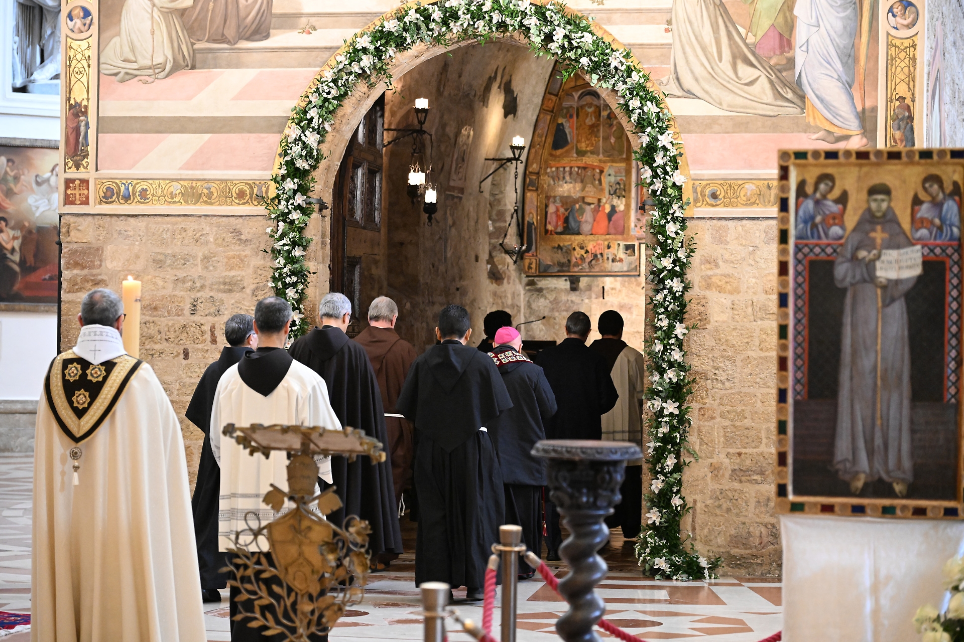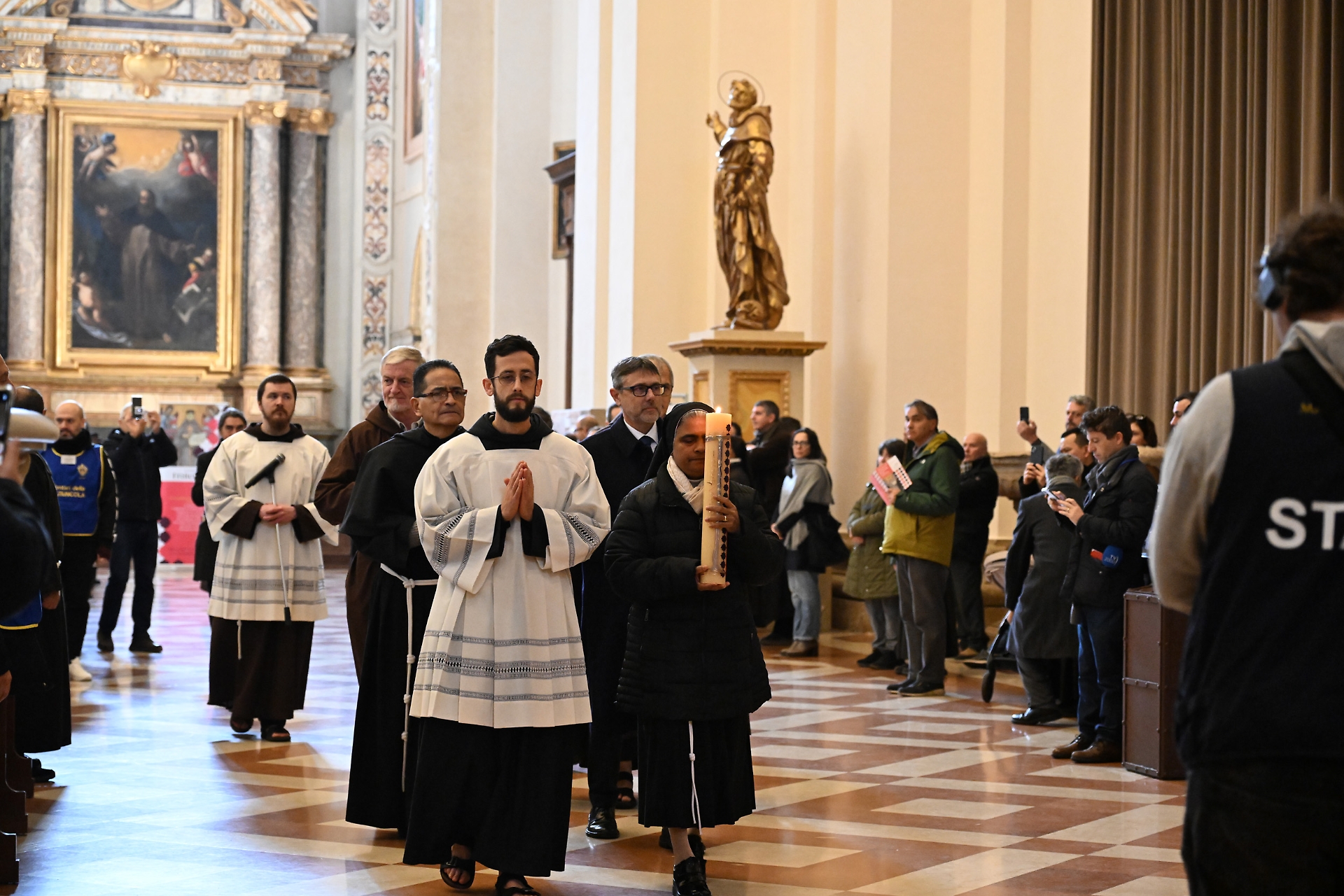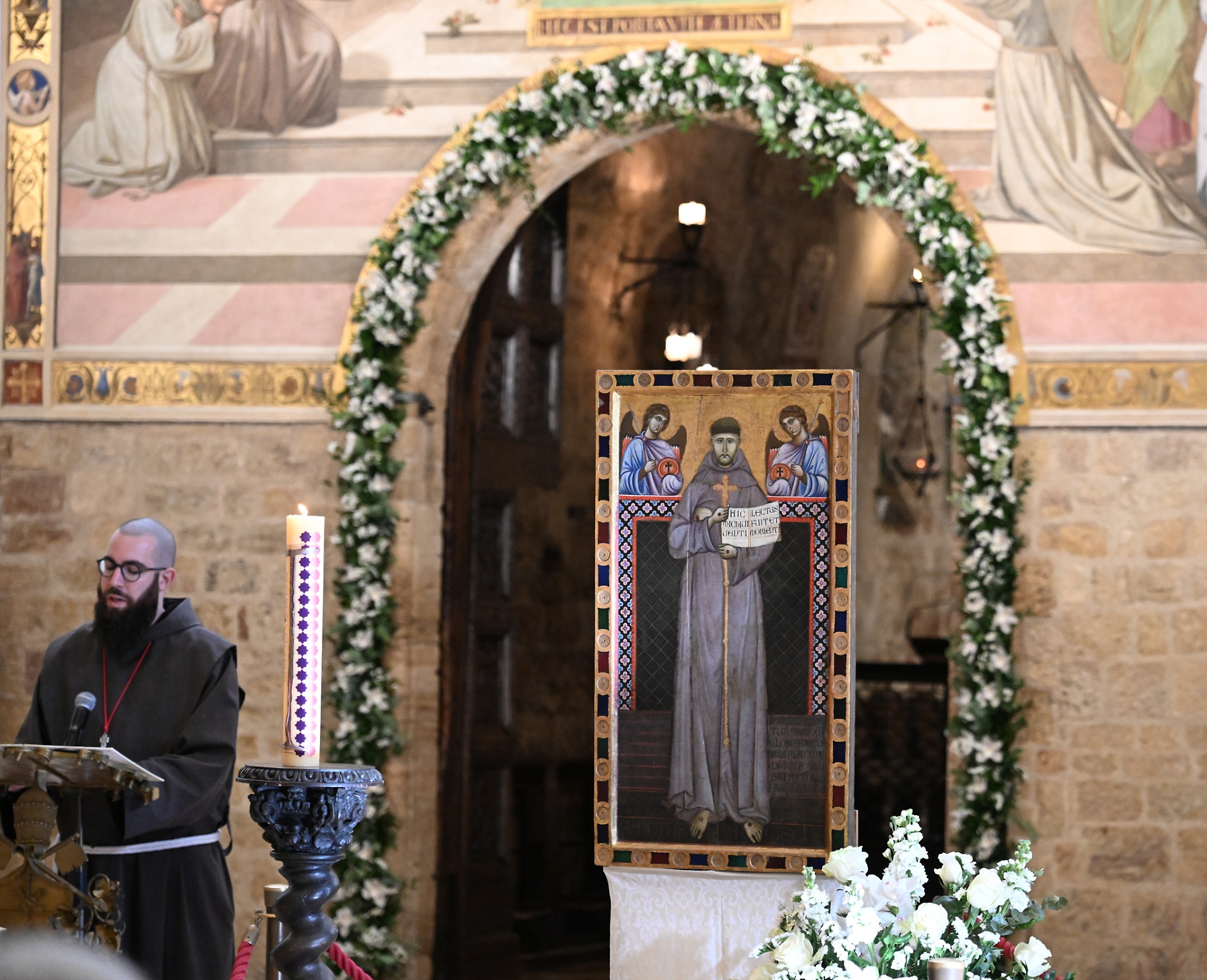 Il rito, presieduto da fra Francesco Piloni OFM, Ministro Provinciale dei Frati Minori di Umbria e Sardegna, è stato inaugurato dalla Liturgia della Luce, momento durante il quale il Vescovo di Assisi-Nocera Umbra-Gualdo Tadino e Foligno, monsignor Domenico Sorrentino, e il Sindaco di Assisi, Valter Stoppini, hanno percorso la navata della basilica portando un cero spento – simbolo dell'umanità fragile segnata dal conflitto – successivamente acceso nella Cappella del Transito.