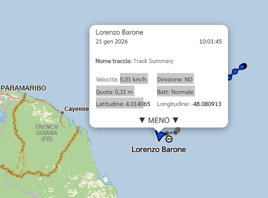 Nessun team di supporto, nessuna comunicazione costante: per chi vuole seguirlo, l'unico strumento è la traccia Gps che disegna lentamente la sua rotta sull'oceano. Secondo le ultime coordinate disponibili, Lorenzo Barone - diretto verso la costa della Guyana francese - si trova oltre la metà del percorso della traversata atlantica, che rappresenta comunque solo una tappa del progetto Dust. E, dalle prime stime, dovrebbe toccare terra tra i 4 e i 6 giorni.