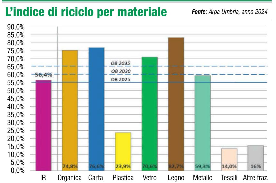 Migliora l’indice di riciclo dei rifiuti in Umbria. E supera la soglia imposta dalla legge. Ma restano critici due materiali fondamentali: plastica e tessili. Le percentuali rispettive, nel 2024, sono del 23,9% e del 14%. La plastica in particolare, è peggiorata rispetto al 2023, quando era a quota 26%. Il riciclo dei materiali tessili è cresciuto di un punto. È quanto emerge nell’ultimo monitoraggio di Arpa Umbria rispetto agli obiettivi posti dalla normativa in materia di gestione dei rifiuti urbani per gli anni 2023 e 2024. Nel 2023, la regione ha riciclato più di 243 mila tonnellate di rifiuti prodotti sul territorio.