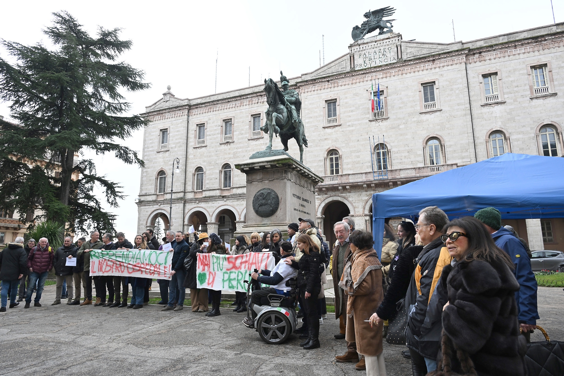 Chiedere tempi certi per la costruzione del nuovo ospedale di Terni. Con questo intento il sindaco, Stefano Bandecchi, ieri mattina ha istituito un gazebo in piazza Italia, davanti al palazzo dell’Assemblea Legislativa dell’Umbria. Resterà attivo fino al prossimo 6 febbraio e sarà presidiato da alcuni rappresentanti del gruppo che è partito in autobus dal palazzetto dello sport di Terni alla volta di Perugia.