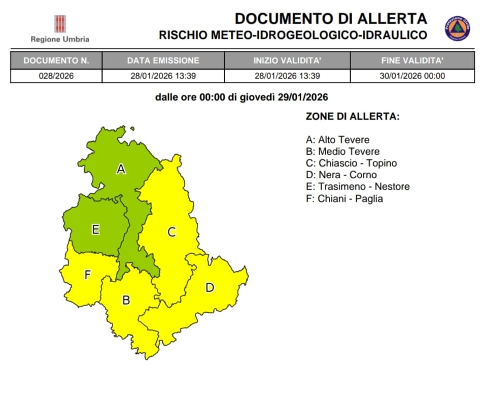 Scatta l'allerta meteo gialla in Umbria per rischio idrogeologico. A comunicarlo la protezione civile con un documento valido dalle ore 13:39 di oggi - mercoledì 28 gennaio - fino alle 00.00 di venerdì 30 gennaio. Nel dettaglio, per la giornata di oggi, in tutte le zone della regione, sono previste precipitazioni sparse, anche a carattere di isolato rovescio o temporale, in attenuazione in serata. Considerando le attuali previsioni metereologiche per la giornata di oggi il Comune di Perugia, in accordo con la Diocesi, ha deciso di annullare la luminaria di San Costanzo. Anche per la giornata di domani continua l'allerta gialla per criticità idrogeologica, nelle zone B,C,D,F. Previste precipitazioni isolate ed intermittenti, anche a carattere di rovescio.