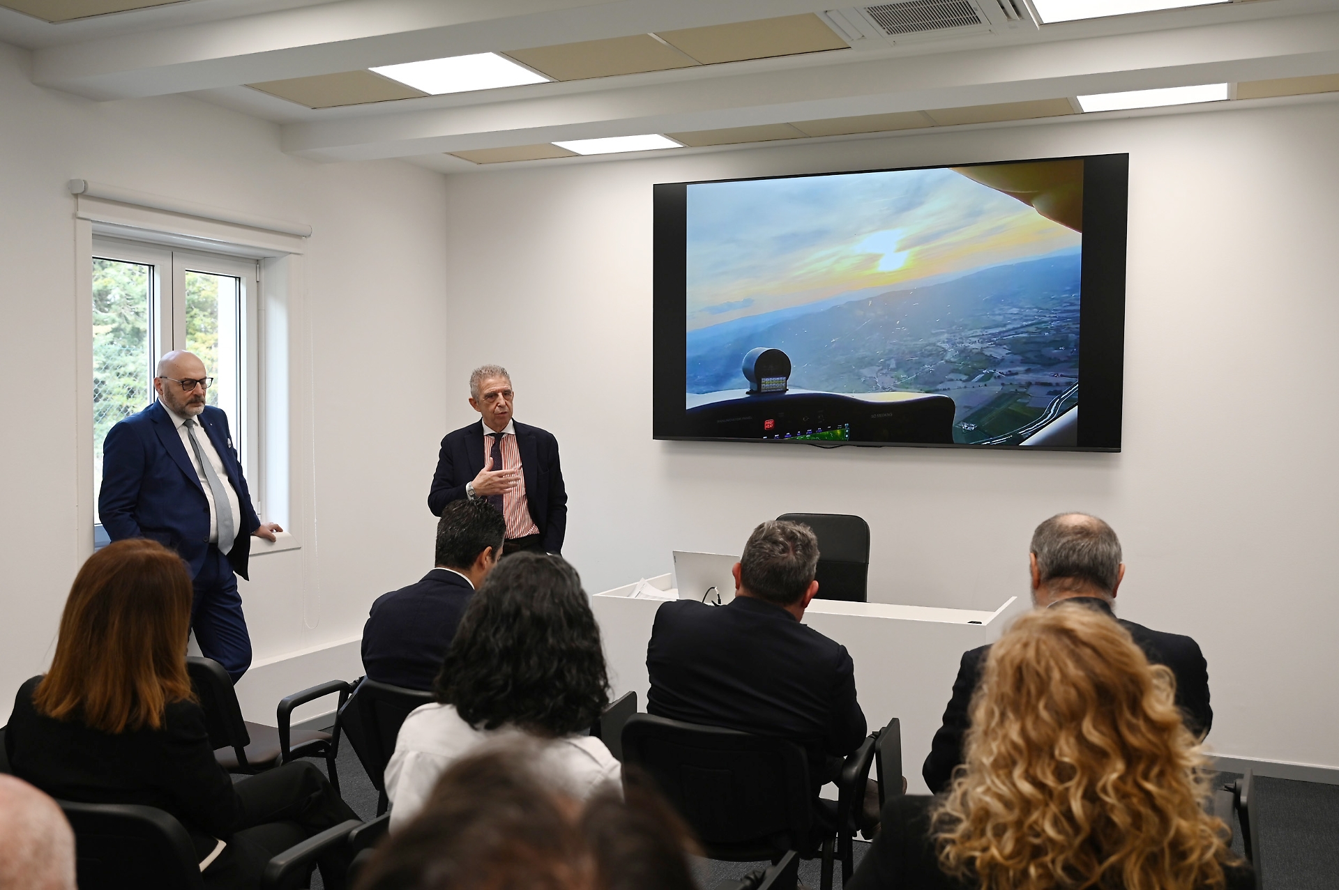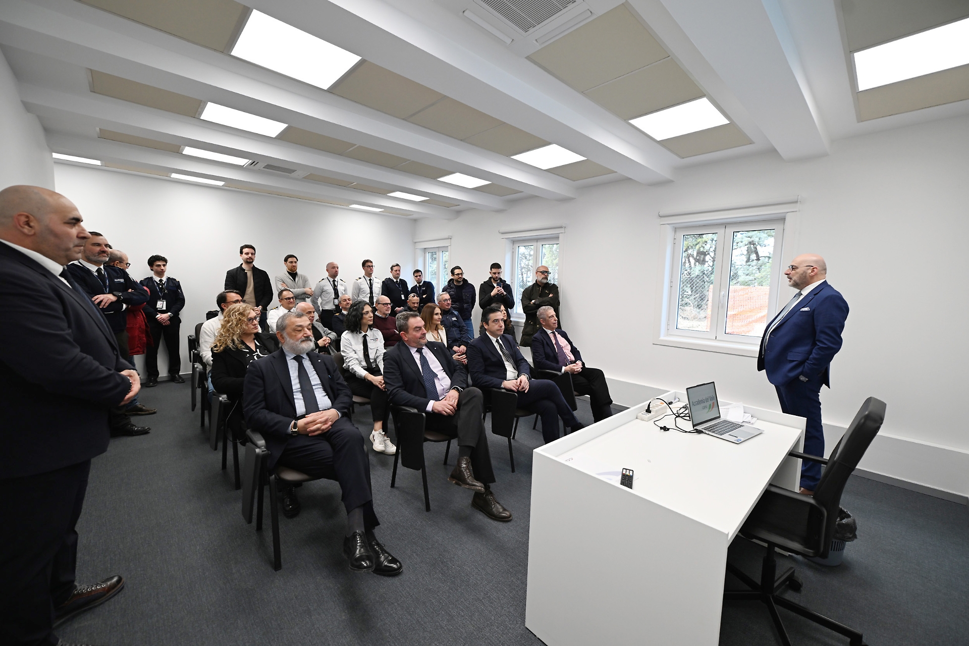 “Questa è una sede che accoglie studenti, management, training management, dove tutti possono riunirsi per entrare in questa grande famiglia. E poi quattro aule studiate appositamente per gli studenti. Nulla è lasciato al caso. Anche la posizione dei banchi, delle lavagne sono per garantire il massimo della formazione. Un punto focale del training department dove tutti gli istruttori possono convogliare, dove si decide la didattica e dove si imposta uno standard qualitativo altissimo. L’aeroporto è a due passi per avere la linea volo diretta e ci permette quindi un’operatività immediata” ha spiegato il comandante Del Bufalo, oltre 7.500 ore di volo, a cui fa capo la supervisione tecnica della formazione dell’Accademia del volo che in questo momento vede 103 studenti tra cui quelli del corso per diventare pilota di aerei privati, il Private pilot license (ora attivo il Ppl 23 chiamato Draco), e quello per diventare pilota di linea, l’Airline transport pilot licence (sta terminando l’Atpl Auriga 5 e iniziando l’Atpl 6).