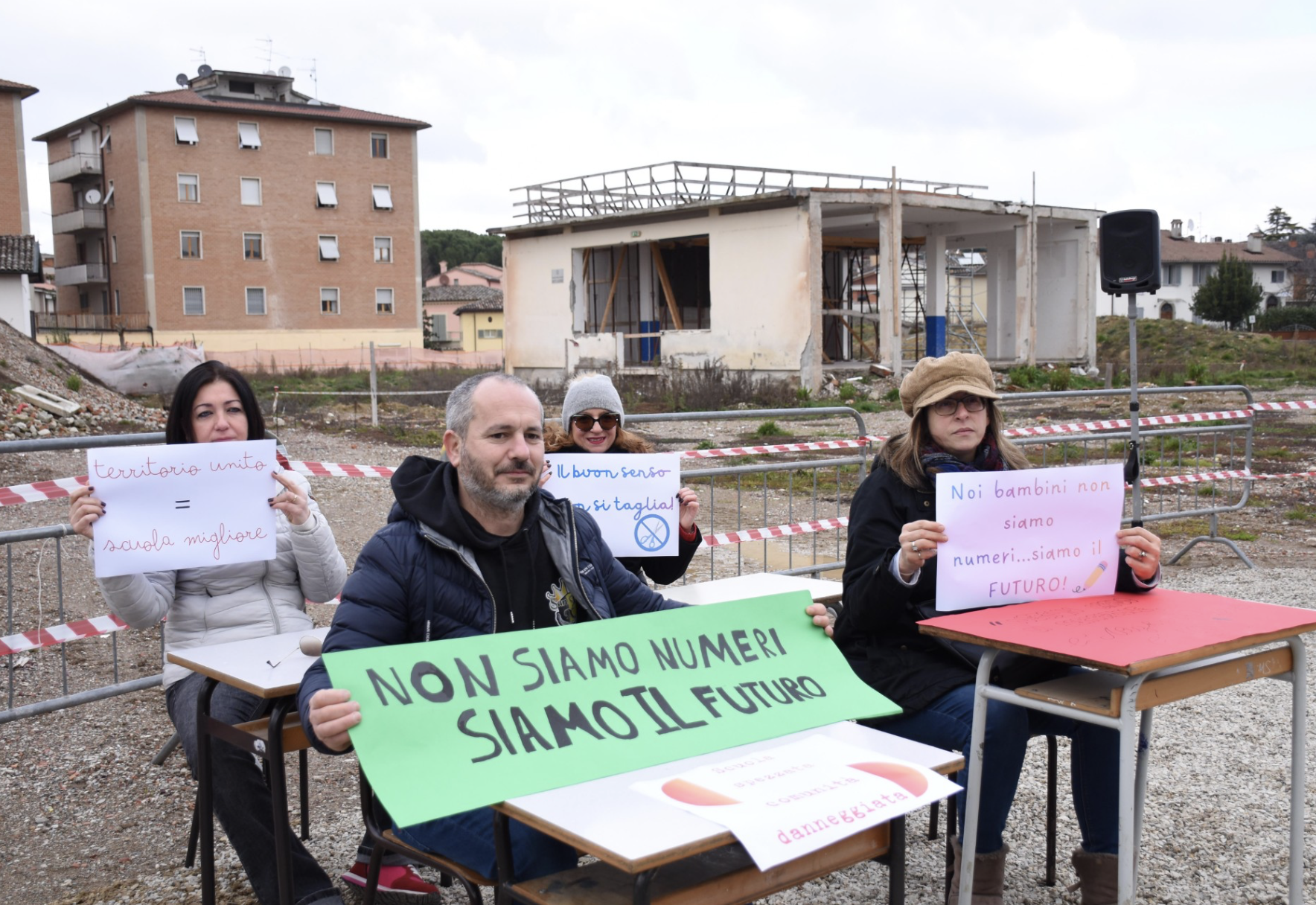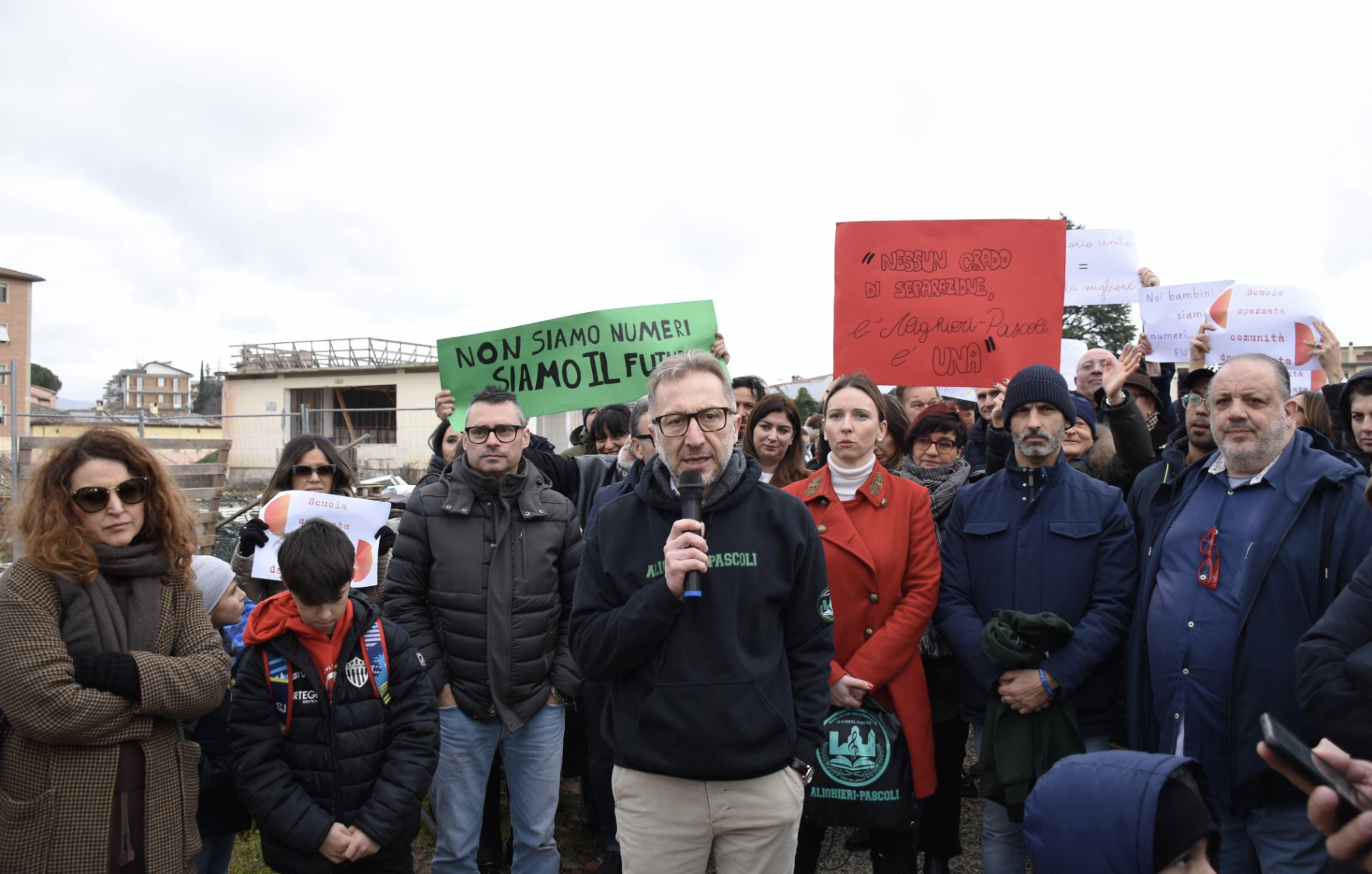 Il sindaco Luca Secondi ha definito la manifestazione "una grande giornata di democrazia e coesione", sottolineando come la scelta del luogo non sia casuale: "Siamo qui davanti all’ex cantiere della scuola per ribadire il nostro no a un provvedimento inaccettabile e per sollecitare il Ministero a riattivare l’iter di ricostruzione della Dante Alighieri, fermo da oltre un anno".