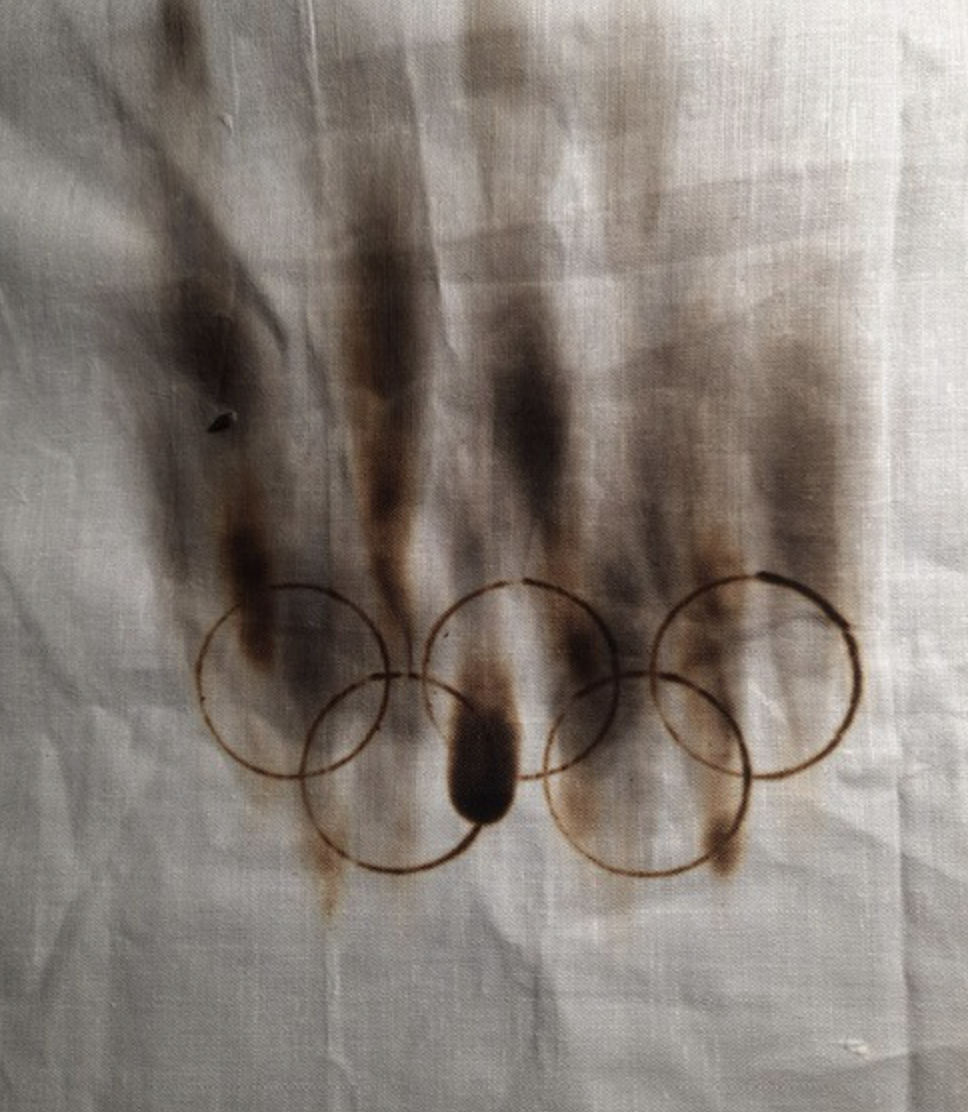 L’opera presentata da Baldicchi propone una bandiera olimpica con i cinque cerchi bruciati, segnata da tracce di combustione e fuliggine sul bianco della stoffa. Un’immagine forte, che richiama direttamente i conflitti in corso nel mondo.