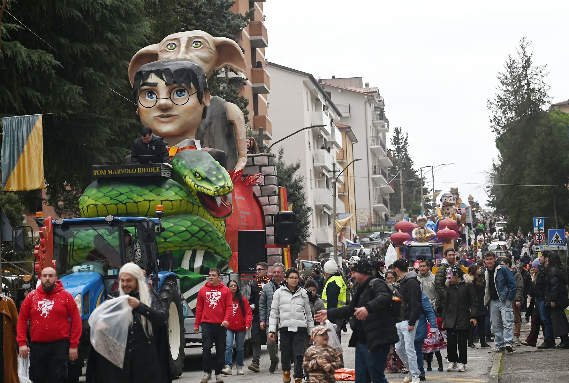 Coloratissimi e corredati dalle maschere dei personaggi indossate dai volontari, hanno sfilato, in ordine cronologico: “Harry Potter e i Maghi di Perugia 2” (Perugia 2), Aladdin (La Torre), “Toy Story, quando i sogni prendono vita” (‘L Toppo), “Lupin III, il ladro gentiluomo” (‘L Cedro), “Il mondo di Tim Burton” (rione misto Borgo Novo e Viale San Sisto).
