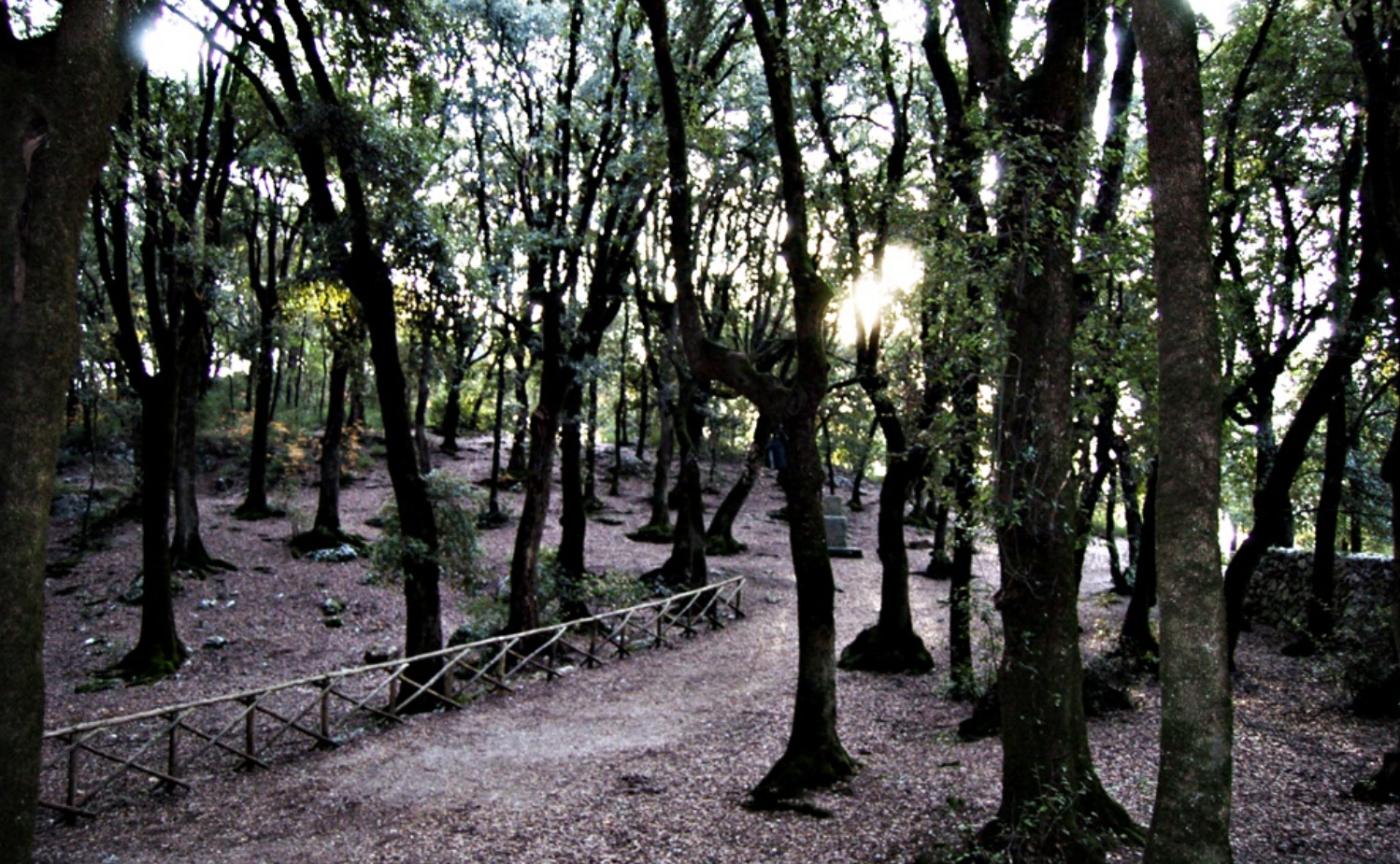 A pochi passi da Spoleto, il bosco di Monteluco prende il nome dal latino “lucus”, con cui i Romani indicavano un bosco sacro dedicato agli dei, protetto da rigide norme come la Lex Luci Spoletina, una delle più antiche testimonianze epigrafiche romane relative ai sacri boschi. Questa legge, incisa su due cippi calcarei databili tra fine III e inizio II secolo a.C., fu scoperta lontano da Spoleto, ma gli originali si conservano nel Museo Archeologico Nazionale della città. La norma vietava di profanare il bosco e consentiva il taglio degli alberi solo nel giorno del sacrificio annuale. Con l’arrivo del cristianesimo, Monteluco divenne un rifugio ideale per la preghiera e il Bosco Sacro continuò a essere tutelato da varie disposizioni. Lo Statuto di Spoleto del 1296 proibiva il taglio degli alberi salvo autorizzazioni speciali, ma alla fine del XVI secolo i cittadini richiesero al Consiglio Comunale controlli tre volte a settimana per prevenire danni da tagli o pascoli abusivi. In questo modo la comunità ha preservato questo bosco nei secoli consentendone la conservazione rimasta pressoché intatta fino a oggi.
