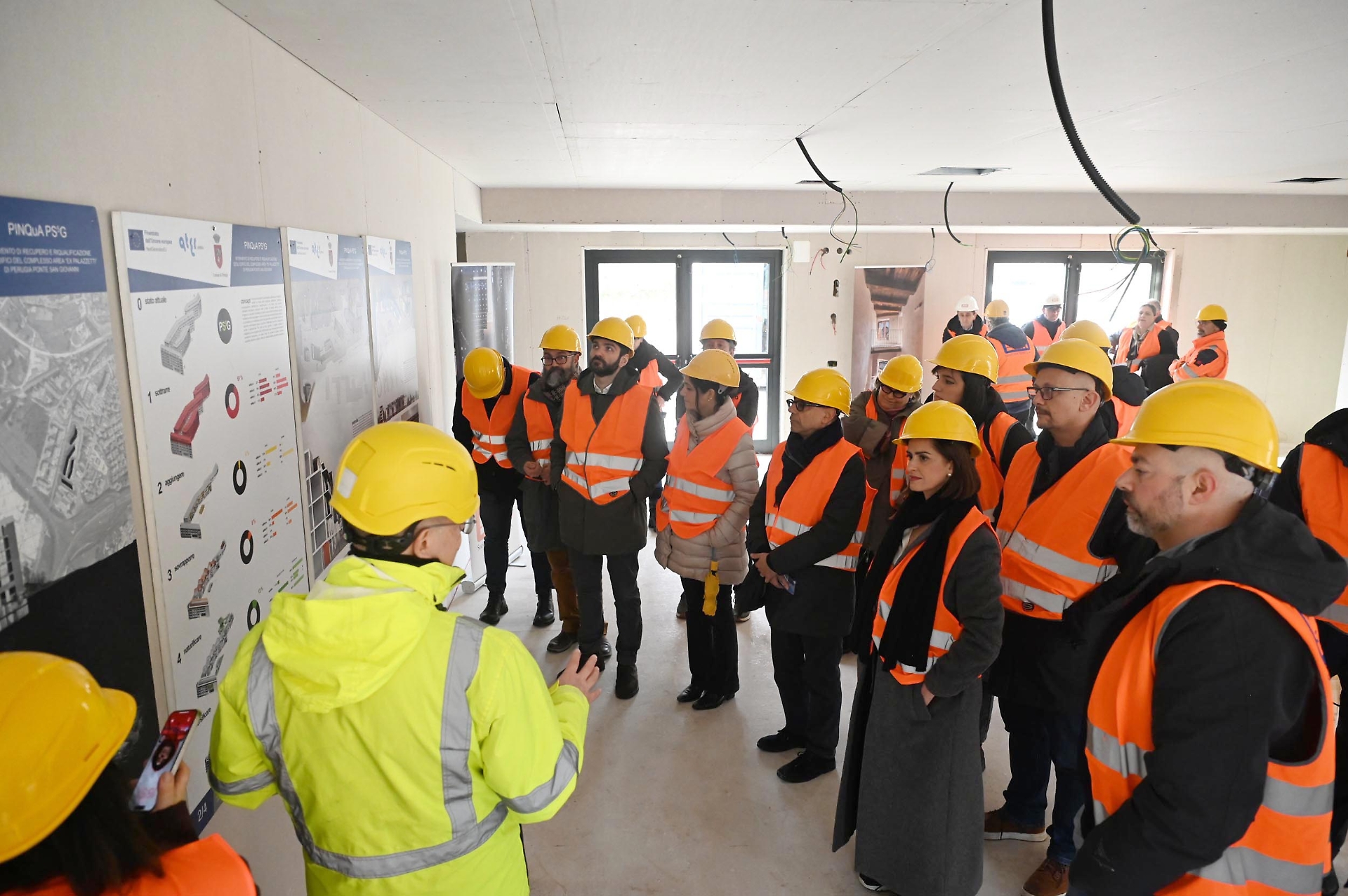 Proseguono spediti i lavori del cantiere Pinqua, nell'area ex Palazzetti di Ponte San Giovanni. Se i dati di ottobre indicavano un avanzamento medio del 25% per i progetti, ad oggi i lavori hanno raggiunto - in anticipo - l’85%. Mercoledì 11 febbraio la giunta comunale di Perugia, insieme al presidente Santi e al direttore Napoletano di Ater Umbria, hanno fatto un sopralluogo per fare il punto sullo stato di avanzamento di uno degli interventi di rigenerazione urbana più rilevanti per la città. Presente anche il responsabile dei programmi Pinqua del Comune, Franco Marini.