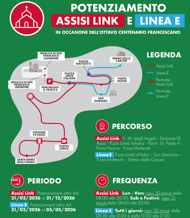 In particolare, verrà rafforzato il collegamento tra la Stazione ferroviaria di Assisi – Santa Maria degli Angeli e il centro storico (Basilica di San Francesco – Piazza Matteotti): nei giorni feriali è prevista una frequenza ogni 20 minuti garantita dalle ore 8 alle 20. Il sabato e nei giorni festivi la frequenza sarà di 15 minuti, sempre dalle 8 alle 20.  In programma anche l'implementazione della Linea urbana E, già sperimentata lo scorso ottobre e ora attiva dal 21 febbraio al 3 maggio. La linea collegherà Piazza Unità d’Italia, San Damiano, Piazza Matteotti ed Eremo delle Carceri, estendendo il servizio verso destinazioni di forte interesse turistico-religioso.