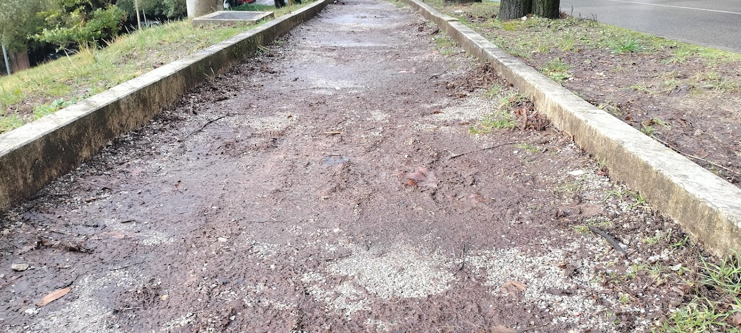 Passiamo all’altro lato: lo sterrato di circa 600 metri (dall’arco di San Costanzo alla scuola San Paolo) è messo ancora peggio, se possibile, perché specialmente in occasione di giornate piovose (e di quelle successive, visto che l’acqua non defluisce) è intransitabile, tra pozzanghere e fanghiglia, senza soluzione di continuità. Quando furono “ingabbiati” gli alberi con due cordoli (anche in questo caso si parla di decenni fa), probabilmente per salvaguardarli, ma visto il risultato complessivo non ne siamo certi, il sentiero perdonale fu coperto con della ghiaia, che ha resistito per un paio di inverni prima di essere mangiata dal terreno. E ciao. Mai più sostituita.