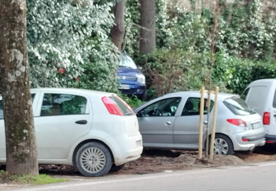 L’abitudine è così radicata (“lì si può parcheggiare” - ci ha risposto bellamente un nostro amico che lavora in centro – non c’è nemmeno il divieto di sosta all’inizio della strada”) che negli ultimi mesi, quando si è proceduto a transennare gli spazi suddetti, per poter procedere alla potatura dei circa 216 alberi, gli automobilisti senza paura hanno infilato le auto sotto le strisce di plastica che delimitavano il divieto e la rimozione forzata. E già pensare all’esigenza di mettere un cartello simile in mezzo agli alberi, per vietare una cosa che dovrebbe essere vietata per postulato, è qualcosa che deve far riflettere. Dunque i pedoni da quella parte non hanno spazio. Inoltre, in assenza di provvedimenti drastici, i nuovi esili alberelli messi a dimora al posto di quelli malati e abbattuti sono stati già circondati. Faranno la fine dei paletti di ferro?
