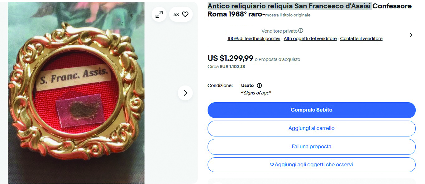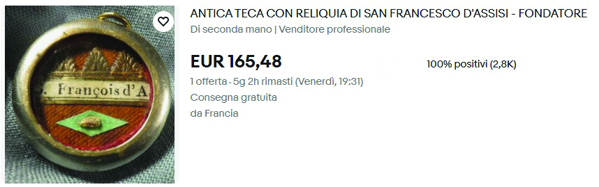 Su eBay per 165,48 euro è in vendita una non meglio precisata reliquia che viene descritta “con oltre 100 anni, ufficiale, sigillata in ceralacca rossa con stemma vescovile a certificare l’autenticità”. Il venditore, francese, propone un’asta (che scade venerdì alle 19.31), e la reliquia ha già decine di visualizzazioni, like e anche alcune offerte. Un altro inserzionista, italiano, sulla stessa piattaforma online, propone un’altra reliquia di San Francesco, anche in questo senza una chiara descrizione, con la formula del prezzo fisso (il “compralo subito”) di 1.103 euro.