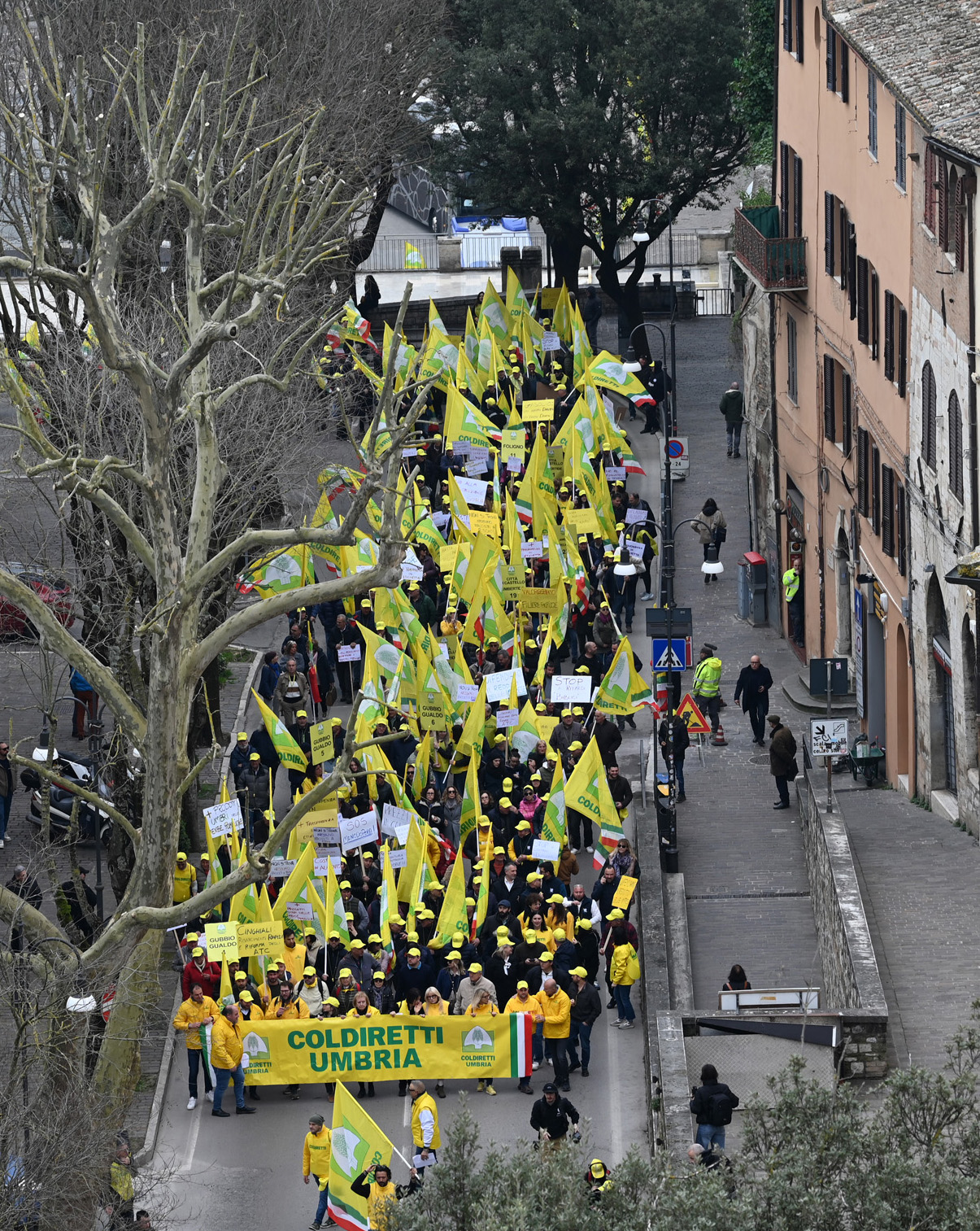 “Questa non è l'Umbria che vogliamo”. È il coro, all'arrivo in piazza Italia, della marea gialla chiamata a raccolta da Coldiretti Umbria sotto un unico grido: “Difendere il reddito delle imprese e degli agricoltori”. Oltre 2 mila imprenditori agricoli, provenienti da ogni angolo della regione, hanno partecipato ieri al corteo, al seguito di una ventina di trattori partiti alle 10 da piazza Partigiani. I mezzi agricoli hanno formato un lungo biscione che - a passo d'uomo - ha attraversato prima Largo Cacciatori delle Alpi, poi viale Indipendenza, impiegando un'ora e mezza per arrivare nel cuore del centro storico.