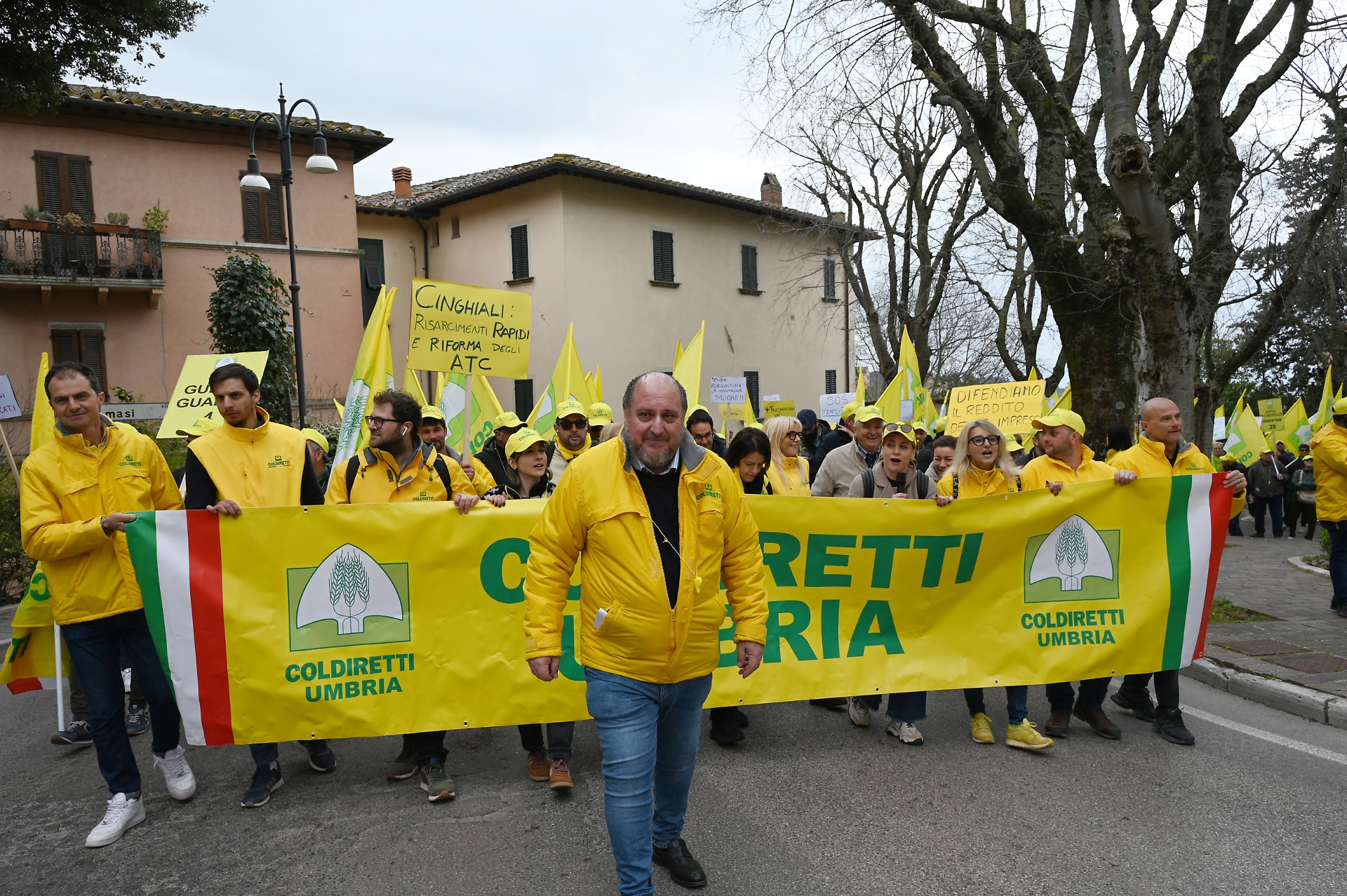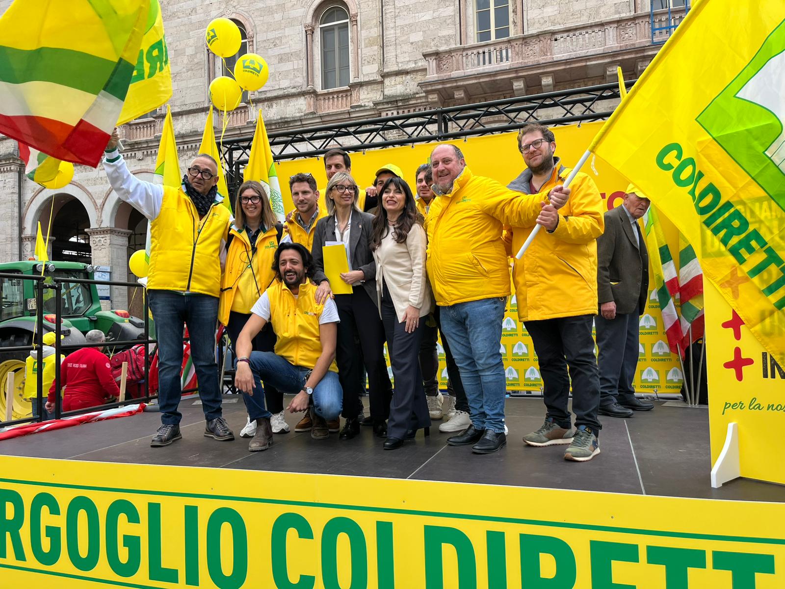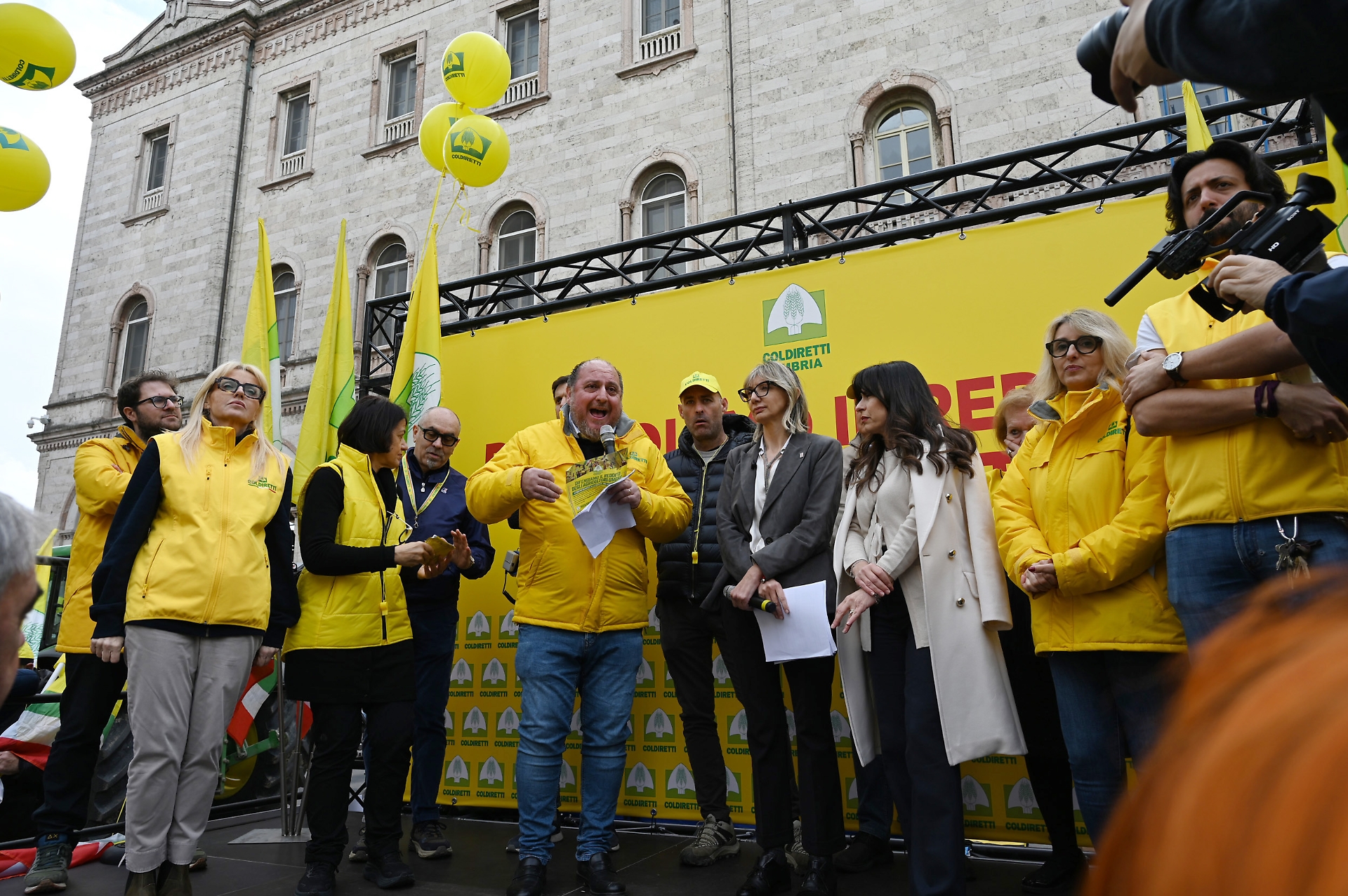 In coda al corteo, il pick-up presidiato dai dirigenti di Coldiretti Umbria a guidare la folla, lanciando cori lungo tutto il tragitto. “Difendiamo il reddito degli agricoltori”. “Più trasparenza in etichetta”. “Più prodotti umbri nelle mense pubbliche”. Solo alcuni degli slogan scritti nei centinaia di cartelli branditi dai manifestanti e appesi sui trattori. Il primo mezzo è entrato in piazza Italia alle 11.15, e così via tutti gli altri a suon di clacson. Alle 11.30 il corteo dei 2mila, capitanati da Albano Agabiti, presidente di Coldiretti Umbria e Mario Rossi, direttore di Coldiretti Umbria. Tutti armati di bandiere e fischietti, hanno preso posizione colorando di giallo la piazza, vestita a festa per l'occasione: palloncini, stand targati Campagna Amica e il palco al centro, rivolto verso palazzo Cesaroni.