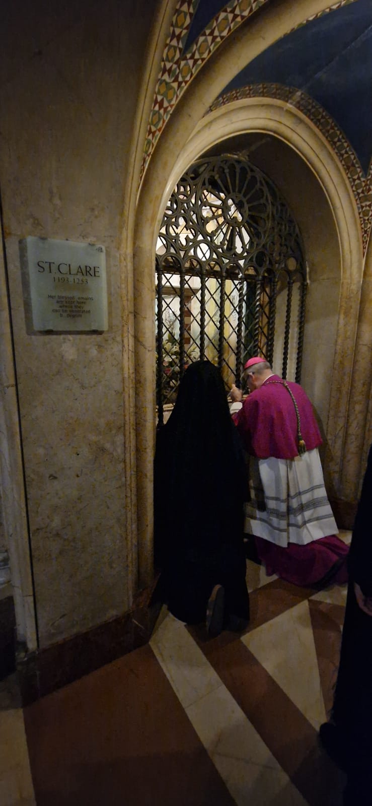 Terzultima tappa del pomeriggio, la preghiera al Santuario della Spogliazione dove monsignor Accrocca, è stato accolto dal Rettore del Santuario, padre Marco Gaballo, dai genitori di San Carlo Acutis e da una rappresentanza di giovani. Alle 17.30 la preghiera nella Basilica di Santa Chiara e il saluto alle Clarisse del Protomonastero, dove il vescovo è stato accolto dal ministro provinciale dei Frati Minori, Piloni, insieme al vicario della comunità dei frati e dalla suora clarissa esterna.