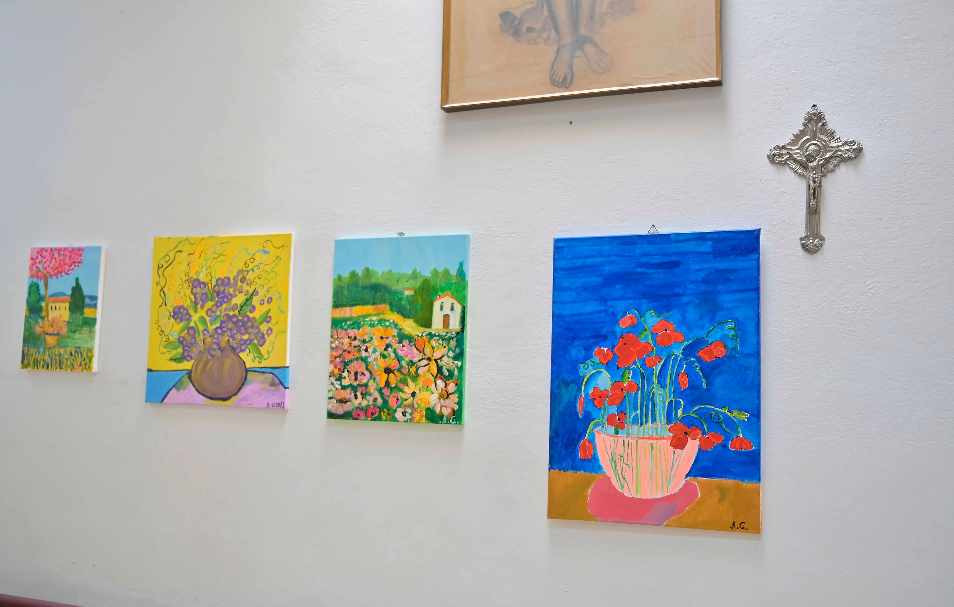 I suoi quadri, ciò che ha di più caro, sono diventati un dono prezioso per gli ospiti della struttura: anziani e adulti in condizioni di fragilità e non autosufficienti. Disegni a tema floreale, paesaggi e volti luminosi e ricchi di colore, usciti dal suo laboratorio di pittura, oggi decorano le pareti del salone dove si svolgono le attività del gruppo “Mai Soli”. Qui persone tra i 18 e i 65 anni partecipano quotidianamente a laboratori creativi, attività manuali, momenti di socializzazione, musica e percorsi educativi pensati per stimolare il benessere psicofisico e valorizzare le capacità individuali.