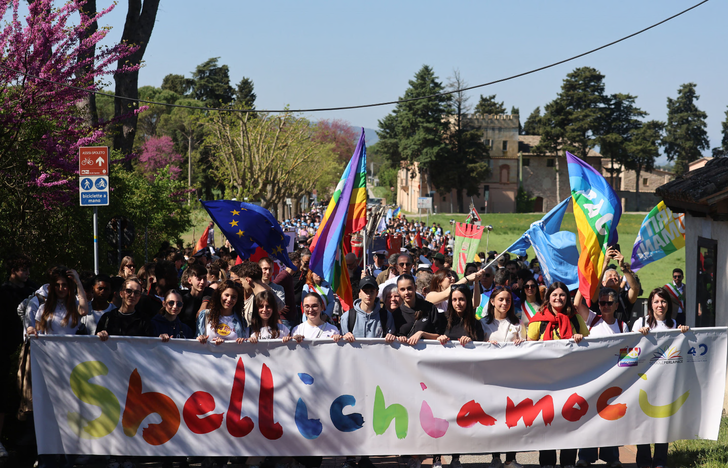 “Sbellichiamoci” è il motto scritto a caratteri cubitali sullo striscione che ha aperto la marcia per la pace, partita questa mattina da Santa Maria degli Angeli e conclusa in piazza San Francesco ad Assisi. Ritrovare il sorriso anche nei momenti più difficili e, soprattutto, liberarsi dal bellum per diffondere una nuova speranza. È stato questo il messaggio al centro dello slogan, accolto quasi come un comandamento dalle migliaia di studenti e insegnanti che hanno preso parte al cammino ripudiando la guerra per abbracciare la pace. Sotto un cielo primaverile e sulle note del brano “Bellomondo” i ragazzi, provenienti da 14 regioni italiane, hanno fatto il loro ingresso in piazza sventolando bandiere arcobaleno e innalzando cartelloni chilometrici in segno di solidarietà con Papa Leone XIV e con le vittime di tutte le guerre in corso. Stanchi ma felici, gli alunni si sono riuniti per prendere parte alle celebrazioni conclusive, guidate dal presidente della Fondazione PerugiAssisi, Flavio Lotti.