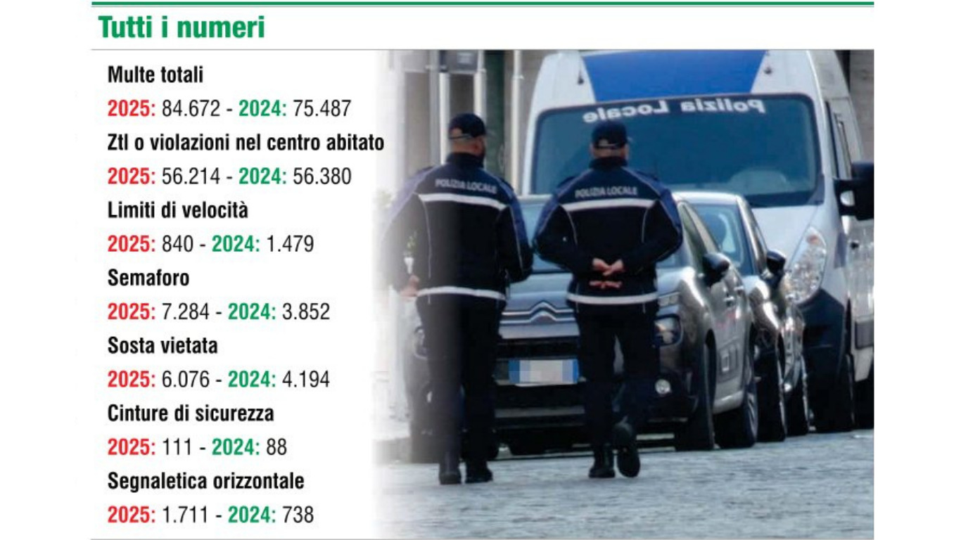 Tornando ai numeri, le violazioni al codice della strada rilevate nel 2025 sono state 84.672, mentre nel 2024 erano state 75.487. Poco più di nove mila multe che provengono da quattro grandi casistiche: il passaggio col rosso al semaforo è passato da 3.852 contestazioni nel 2024 a 7.284 nel 2025. Il motivo è semplice: i documentatori sono stati sostituiti e adesso sono molto più accurati, quindi, al contrario di prima, molti verbali non vengono cestinati. Aumentano anche le violazioni che riguardano la sosta: quelle dell’articolo 157 del Cds sono passate da 4.891 a 6.938, mentre per l’articolo 158 da 4.194 a 6.076. Resta invece praticamente invariato il dato relativo alle violazioni nel centro abitato (ztl, parcheggio etc): 56.241 nel 2025, 56.380 nel 2024.