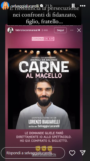 Nel miro dello spettacolo di Corona c'è finito pure il compagno della Lucarelli. Sulle storie Instagram, l'ex re dei paparazzi ha postato la locandina dello spettacolo a teatro di Biagiarelli scrivendo: "Le domande gliele farò direttamente io allo spettacolo. Ho già comprato il biglietto". Subito arriva la risposta della giornalista che posta una storia e dichiara: "Rincomincia la persecuzione nei confronti di fidanzato, figlio, fratello...".