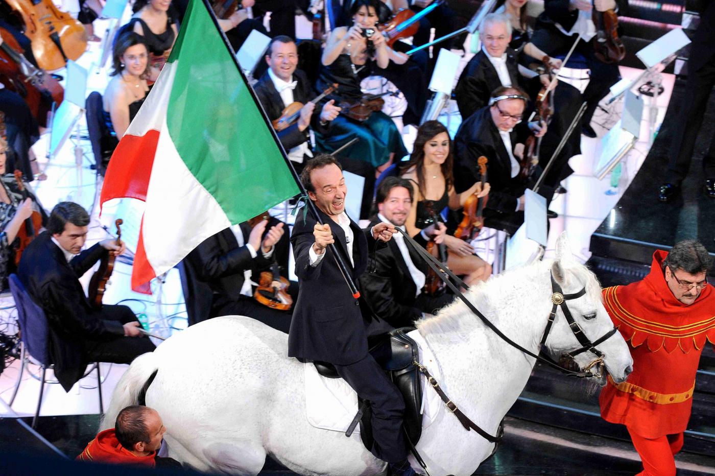 2011: Forse la più memorabile delle ospitate dell'attore toscano al Festival. In occasione della terza serata di Sanremo 2011, dedicata al 150º anniversario dell'Unità d'Italia, Roberto Benigni si presenta all'Ariston cavalcando un cavallo bianco, intrattenendo il pubblico per più di 50 minuti (momento in cui si raggiungono picchi di ascolti vertiginosi, con uno share del 60%). Narra la storia dell'Unità d'Italia, del Canto degli Italiani e della bandiera italiana. Chiude cantando da solo, senza accompagnamento, l'Inno nazionale italiano, a cui segue una lunga ovazione del pubblico dell'Ariston.