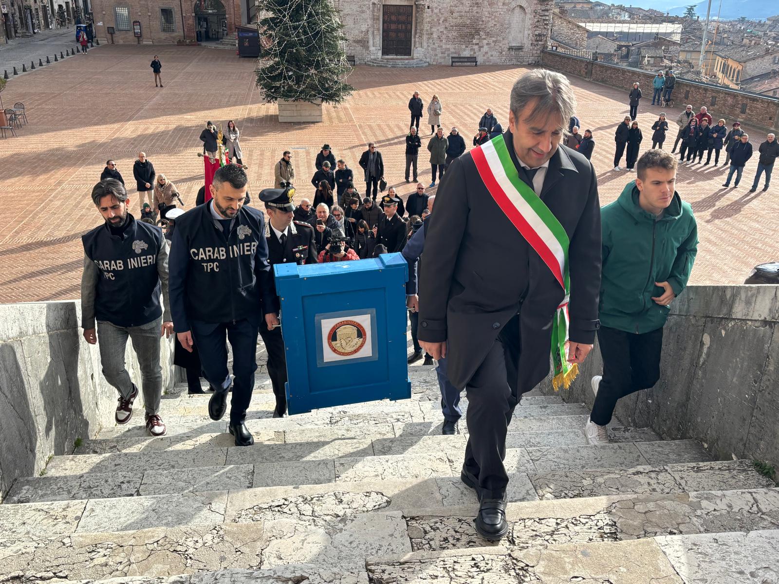 Era la notte tra il 18 e 19 marzo del 1979 quando a Gubbio, approfittando della momentanea disattivazione dell'allarme, ladri entrarono nel museo di Palazzo dei Consoli calandosi da una delle finestre e portando via una delle preziose opere custodite al suo interno la Madonna del Melograno. Il rocambolesco furto subito sembrò messo a segno su commissione. Da quel momento il Comando Carabinieri TPC ha avviato un’intensa attività di ricerca, anche attraverso la diffusione di quanto accaduto su media nazionali e trasmissioni televisive. Si è rivelata poi fondamentale l’inserzione della foto della tavola nella “Banca Dati dei beni culturali illecitamente sottratti” e nel Bollettino delle opere d’arte trafugate del 1982 e dopo 45 anni, l'11 dicembre del 2024 il dipinto è tornato a casa.