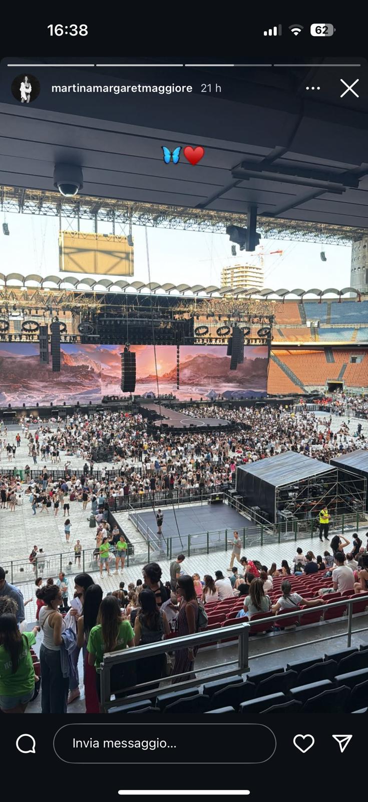È stata la stessa influencer ad annunciare la sua presenza allo Stadio Meazza con una foto del palco accompagnata da due emoji: un cuore e una farfalla azzurra . Poi un video dove, emozionata, esclama ironicamente "L'ho presa benissimo, non ho pianto mai". A completare il quadro della serata, un TikTok dell'amico Mauro Bianchi che ha raccontato come i due abbiano lasciato il concerto a metà dello show, a causa delle troppe lacrime versate dalla 28enne: "Adesso ride, ma ha pianto per tutto il concerto..." - ha scherzato l'amico di Martina.