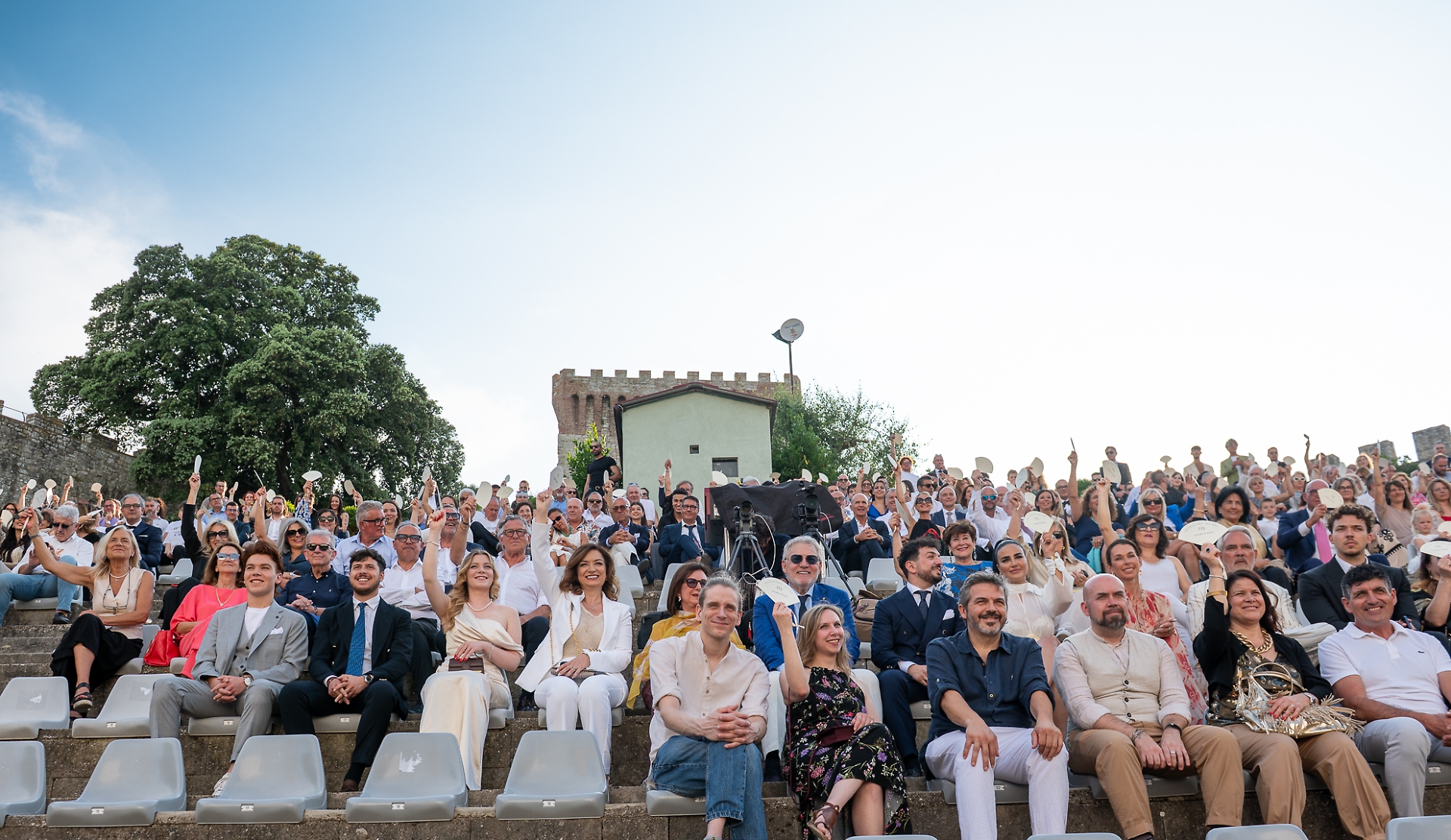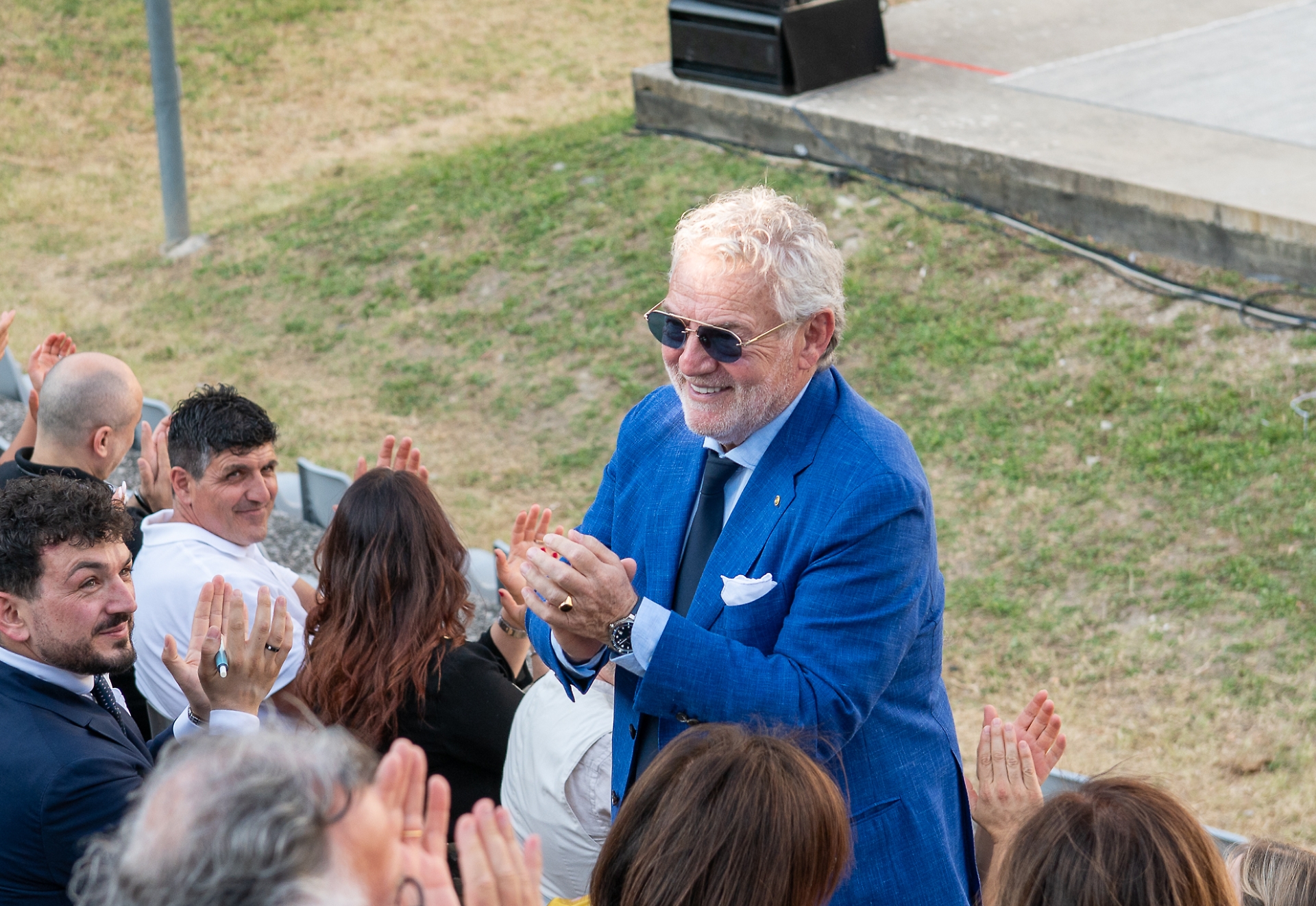 Organizzata nei minimi dettagli dalla sua famiglia, con in prima linea i figli Michela e Thomas, quella che si è celebrata alla Rocca del Leone di Castiglione del Lago, sulle sponde del lago Trasimeno, è stata molto più di una festa di compleanno. È stato un tributo. Di quelli veri. Di quelli che si fanno quando si vuol dire “grazie” non per dovere, ma per sincera gratitudine. E in effetti, in quella serata scandita dalla musica, dalle risate e da un ponentino che ha pensato bene di farsi invitato speciale per rinfrescare un giorno d’estate particolarmente caldo, c’erano tutti: oltre 500 persone, tra amici, dipendenti, colleghi e imprenditori. E ovviamente c’erano Claudio, la moglie Nadia, i figli, i nipoti Aisée e Alexander e un’aria di festa che aveva più il sapore di una rimpatriata affettuosa che di una cerimonia formale. Anche se, va detto, qualche qualche smoking si è visto. E tutte le signore erano particolarmente eleganti. Ma il clima era quello giusto: raffinato, ma senza spocchia. Quello che si crea solo quando l’affetto è reale e condiviso.