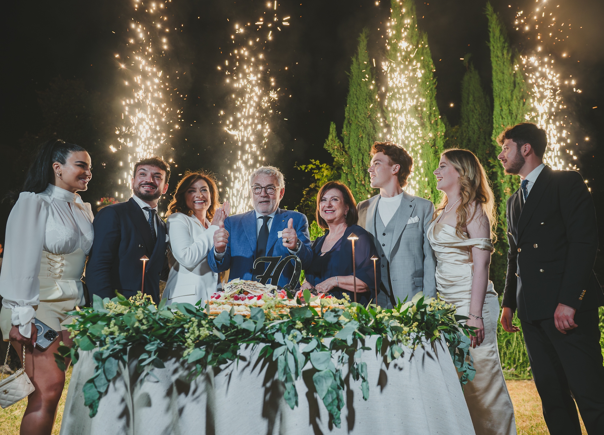 Per i 240 che hanno ricevuto anche l’invito alla “seconda parte”, la festa è continuata all’Osteria Nova, con vista mozzafiato sul Trasimeno, tra cene di gala, brindisi, abbracci e – come è giusto che sia – il taglio della torta. Un dolce finale che ha visto Claudio Sciurpa, commosso ma sorridente, stretto nell’abbraccio dei suoi cari e degli amici di una vita.