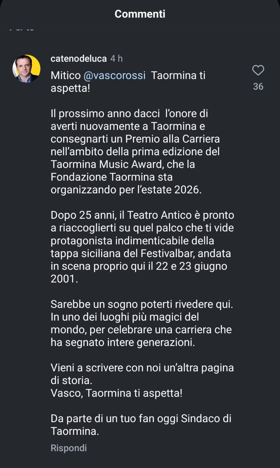 Tra i commenti salta all'occhio quello del sindaco Cateno De Luca che coglie l'occasione per invitare Vasco a Taormina la prossima estate: "Taormina ti aspetta! Il prossimo anno dacci l’onore di averti nuovamente a Taormina e consegnarti un Premio alla Carriera nell’ambito della prima edizione del Taormina Music Award, che la Fondazione Taormina sta organizzando per l’estate 2026. "Dopo 25 anni, - prosegue il primo cittadino -. il Teatro Antico è pronto a riaccoglierti su quel palco che ti vide protagonista indimenticabile della tappa siciliana del Festivalbar, andata in scena proprio qui il 22 e 23 giugno 2001. Sarebbe un sogno poterti rivedere qui. In uno dei luoghi più magici del mondo, per celebrare una carriera che ha segnato intere generazioni". A chiusura del lungo commento si legge: "Vieni a scrivere con noi un’altra pagina di storia. Vasco, Taormina ti aspetta! Da parte di un tuo fan oggi Sindaco di Taormina".
