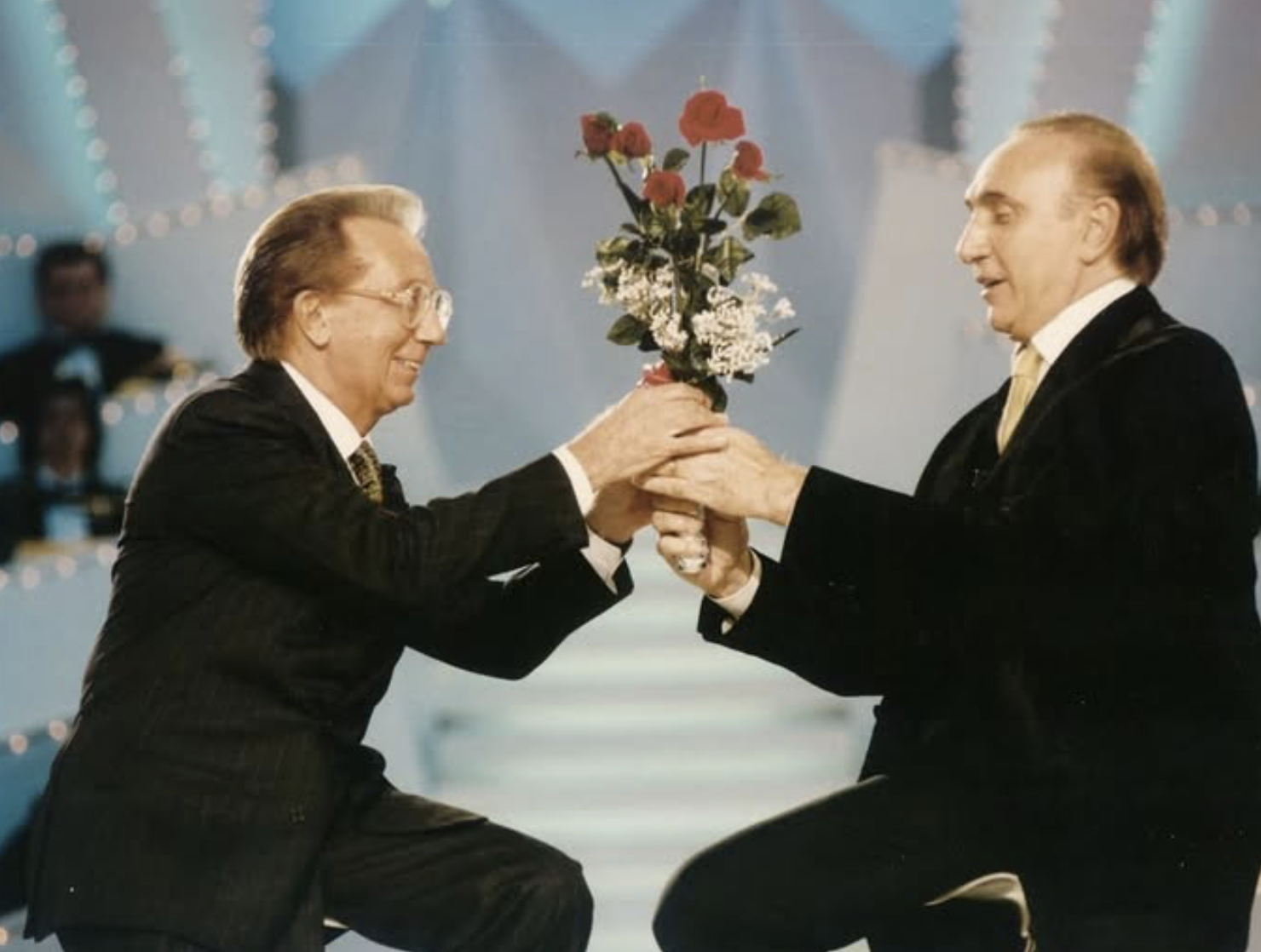 Raimondo Vianello (1922-2010) fu il volto dell’ironia e del garbo. Dapprima in coppia con Ugo Tognazzi, poi insieme a Sandra Mondaini, con cui firmò trasmissioni storiche. La sitcom Casa Vianello rimase in onda per quasi vent’anni, diventando uno dei programmi più amati della tv italiana. Nel 1998 fu anche conduttore del Festival di Sanremo.