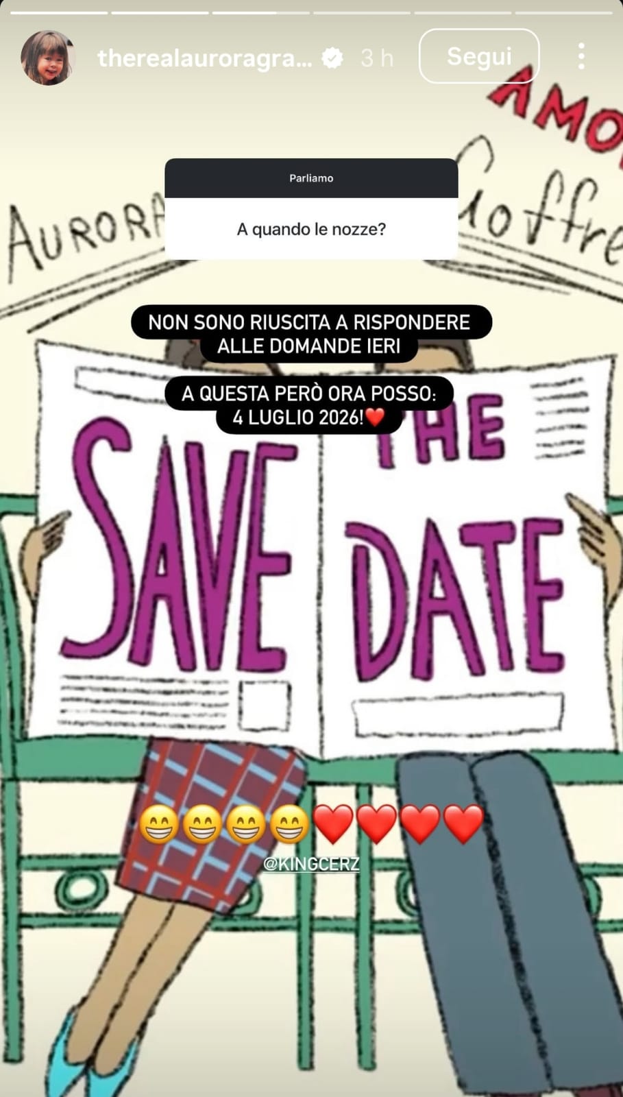 Il "Save the date" è stato ufficialmente annunciato e questo per Aurora significa solo che "Succederà. Non avevamo dubbi a riguardo però ora esiste una data quindi è ancora più reale". Dopo la nascita del loro primo figlio Cesare, Aurora Ramazzotti e Goffredo Cerza convoleranno a nozze tra otto mesi, più precisamente il 4 luglio 2026.