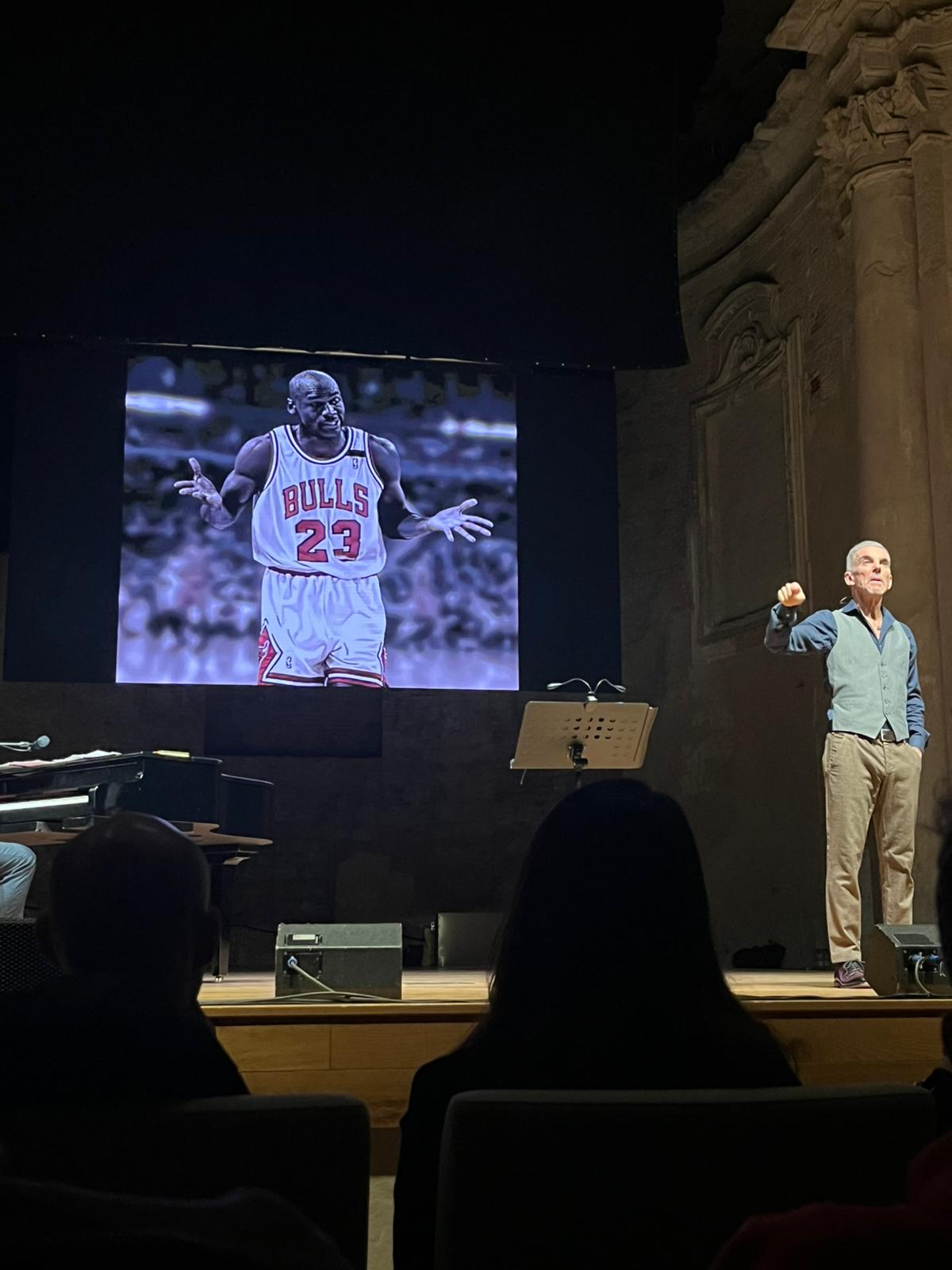A Perugia ha scelto di portare il ritratto di uno dei più grandi sportivi di tutti i tempi. Lo storyteller ha esordito parlando di un antico proverbio giapponese secondo cui l’uomo ha tre cuori: uno sulle labbra, perché il mondo lo veda; un altro nel petto, da mostrare agli amici; e infine uno segreto, nel profondo, a cui nessuno arriva. È da qui che parte per raccontare la storia di Micheal Jeffrey Jordan, soffermandosi in particolare sull’infanzia e l’adolescenza, che hanno avuto una grande importanza nel lungo processo che lo ha portato a diventare leggenda.