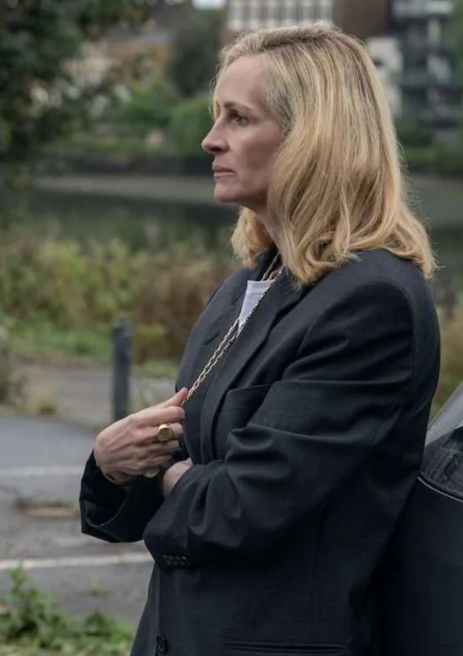 Ispirato ai power suit degli anni '90 della stessa Roberts (si pensi ai blazer doppiopetto con spalle Armani e pantaloni a righine), i look di Alma diventano man mano sempre più difficili da decifrare: "È una donna upper-class, intelligente e pratica, che lavora in un mondo maschile. Ho bilanciato eleganza e casual daywear, con blazer e camicie button-down abbinate a jeans, ma senza cardigan comodi o abiti fluenti. Linee taglienti per trasmettere costrizione, sapendo che nasconde un segreto", racconta Piersanti a ELLE. Man mano che la trama si infittisce – con Alma a un bivio tra lealtà e verità – il suo guardaroba si evolve. I blazer oversize e le camicie bianche cedono il passo a dettagli più cozy e leggeri, come a simboleggiare "che il segreto è emerso", nota la costumista. I vestiti armano la protagonista contro le pressioni istituzionali, ma ne rivelano la vulnerabilità, trasformando il tailleur in metafora di una "power dressing" repressa.